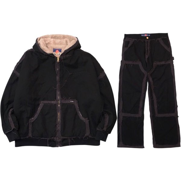 本コラボレーションはデザイナー神⾕氏が私物で所有しているblackmeansの“Cut-out Denim Shoe Cut Pants”に感銘を受け、KAMIYAの定番であるジップパーカー、ペインターパンツに落とし込み、クロスオーバーさせたデザインとなっております。