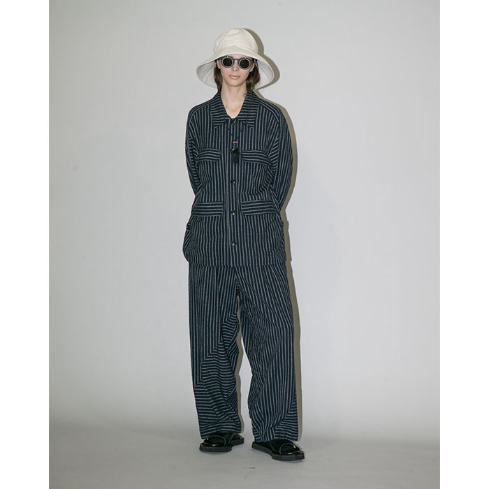 ストライプのセットアップにハードな加工とブランドらしいエッセンスが花咲く1品。
