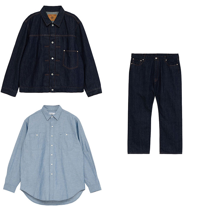 デニムジャケットとパンツのセットアップ、そして色味があるシャンブレーシャツ。