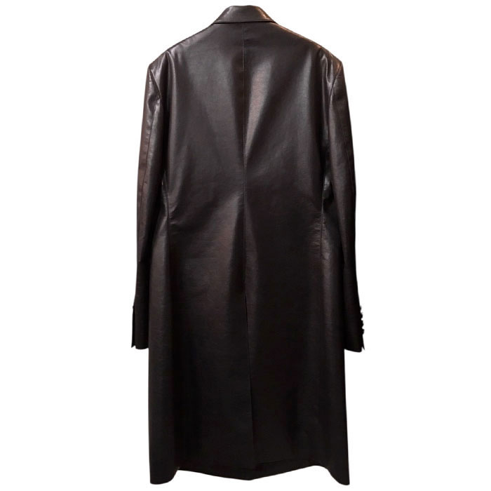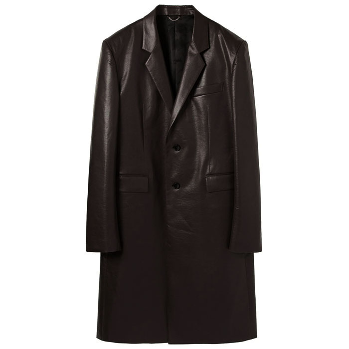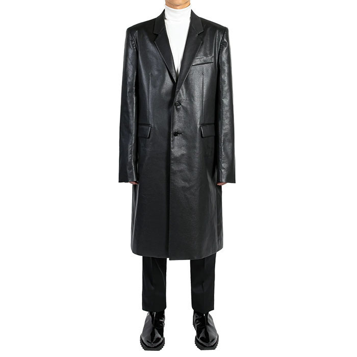 優れた保温性をもつ薄手で軽い着心地のヴィーガンレザー素材を使用したシングルブレストコート。