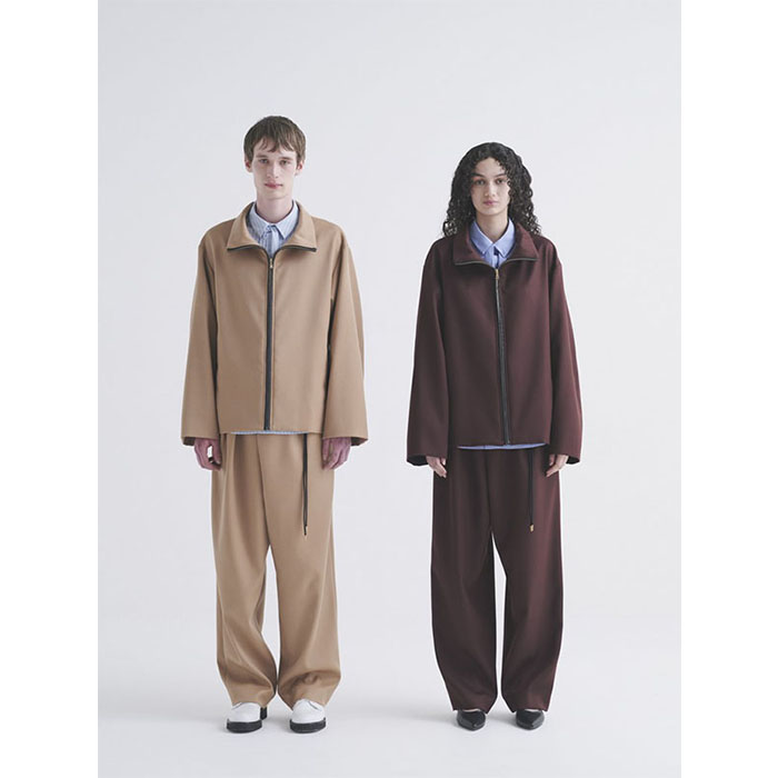 衿のスタンドカラー、身頃のボックスシルエット、腰ポケットはフロントZIPと同じ地面に垂直にとりすべて直線的なパターンで構成し、さりげなく覗くゴールドの引手が上品なCULLNIらしくミニマムに仕上げた1着です。