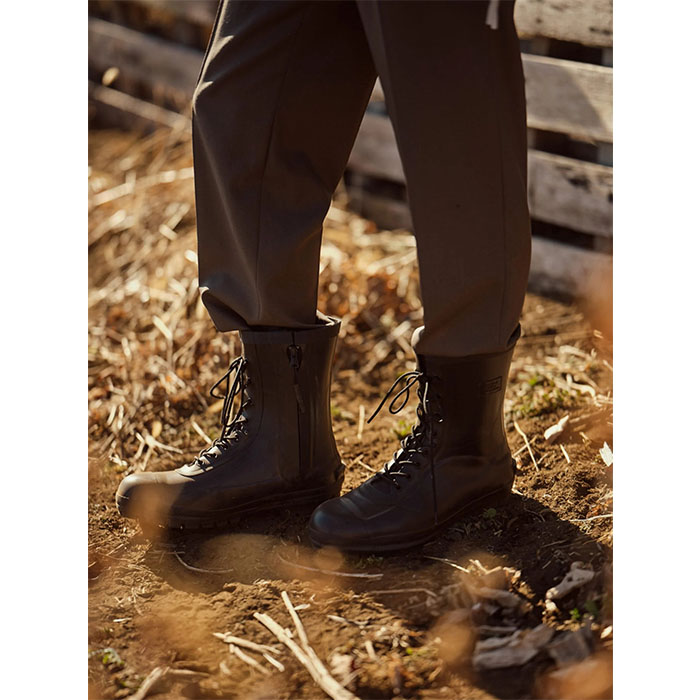 ・ゴム素材の柔軟性とレースアップ仕様でフィット性が高くブーツ