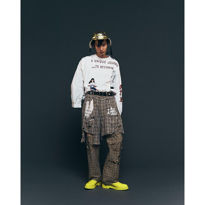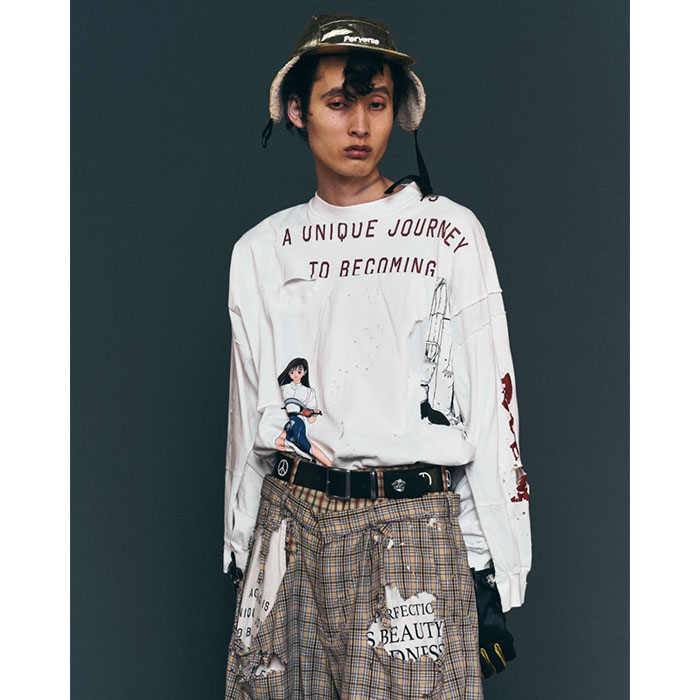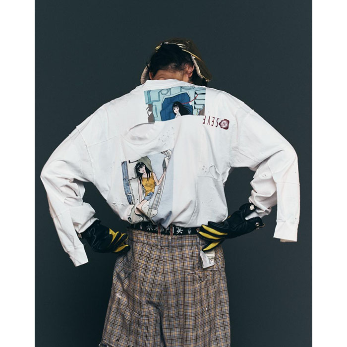 代表作・ストップ!! ひばりくん!や老人Zでも知られる江口寿史氏のグラフィックを贅沢にも数種、大胆にプリントしたTシャツを解体・再構築し、パッチワークで仕立てたロングスリーブTシャツ。