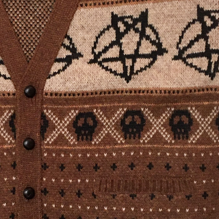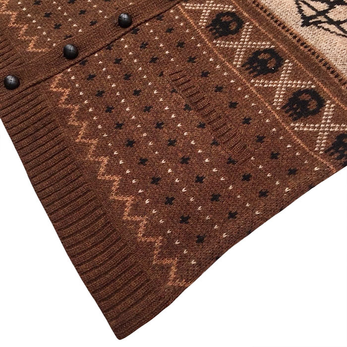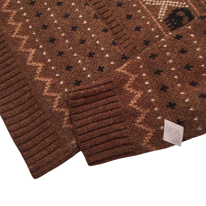 ノルディック柄をベースとしながらも、逆五芒星やスカルフェイスを混ぜ込むなど、ブランドらしさのあるオリジナルの図案を編み込んでいます。