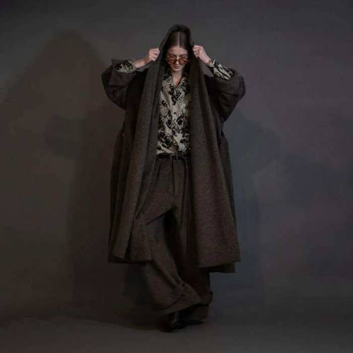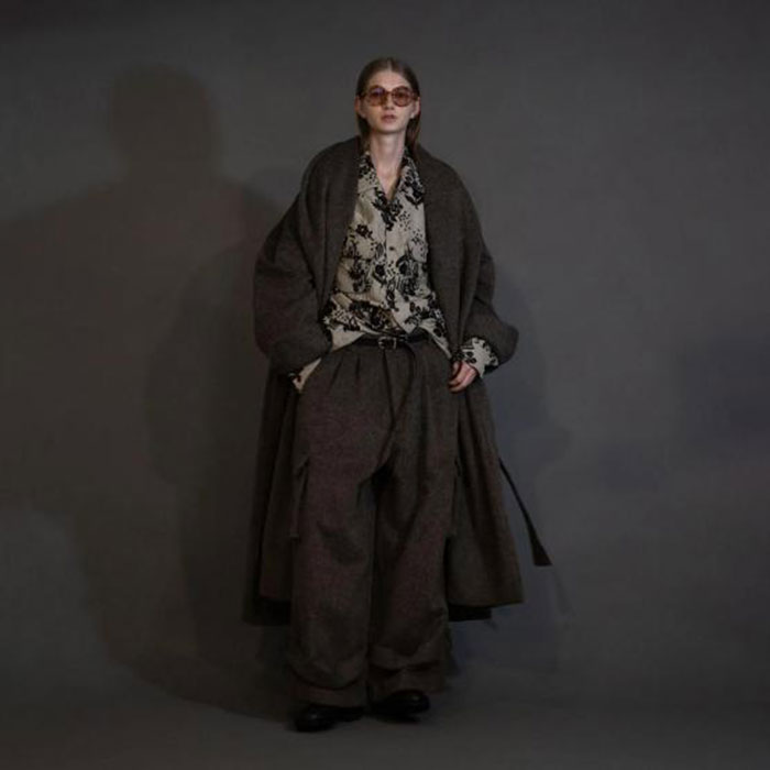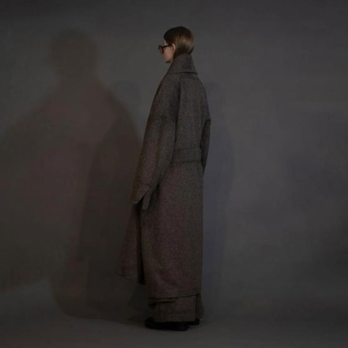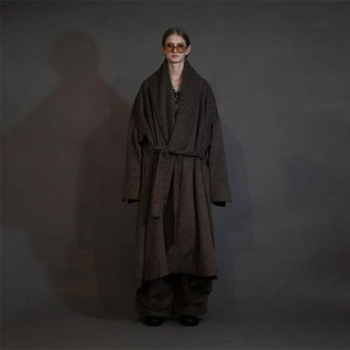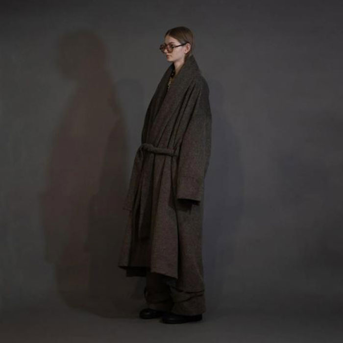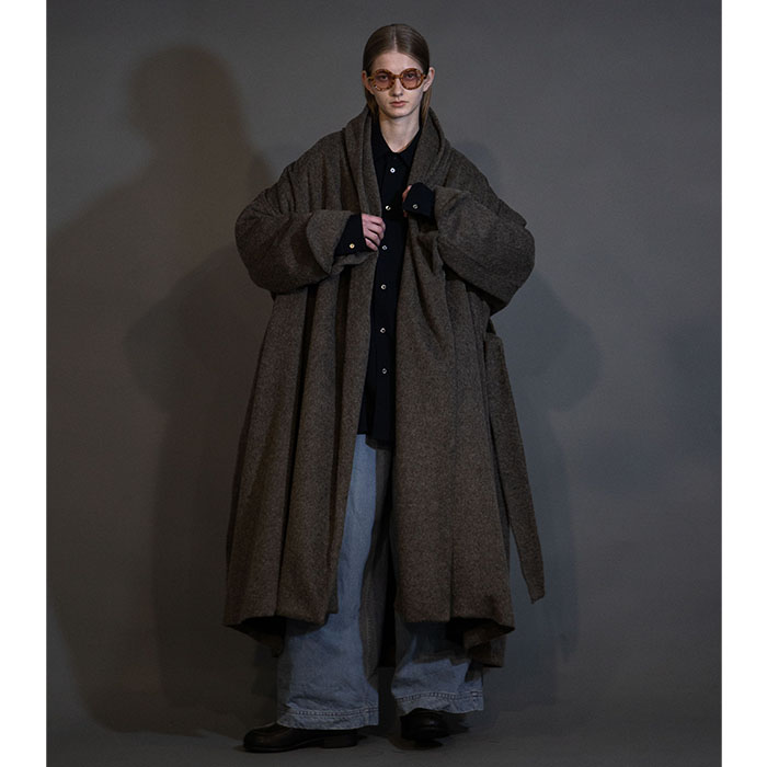 ブランドの提案としてのゆったりとしたリラックス感を纏えるショールカラーガウン調。