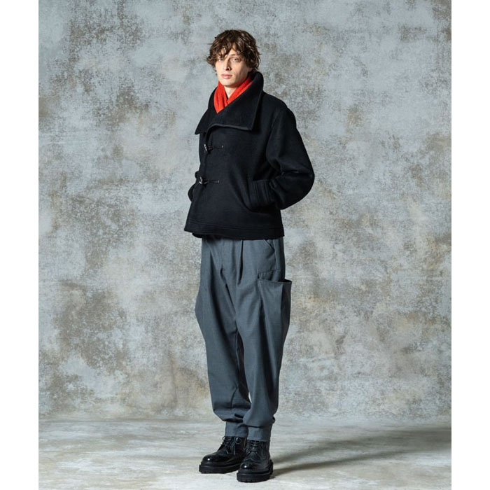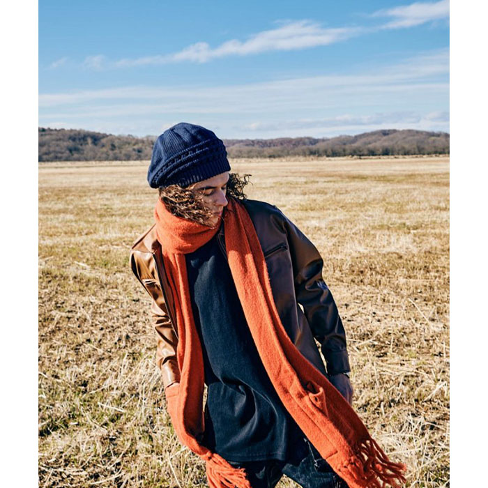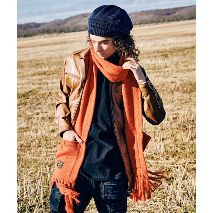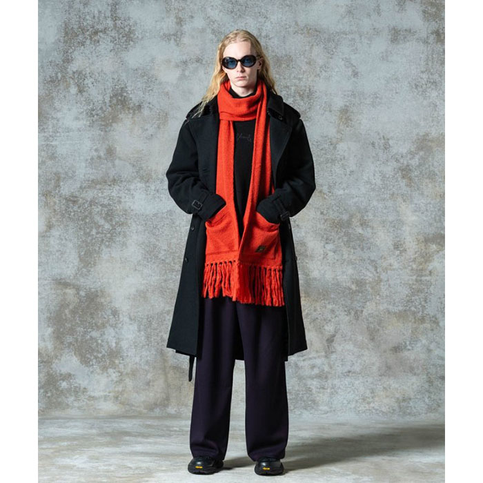 大判マフラーにワンポイントデザインを乗せることでアクセサリーとしての存在感をより高めたPocket Muffler。フライス編みで仕上げた250cmのロングシルエットは先端にフリンジを加えたノスタルジックな佇まい。さらに両端にはボタン留めのポケットを設け、アクセントとしてブランドタグもあしらったディテール感のあるルックスが秋冬のスタイリングにテクニカルな楽しさをプラスします。