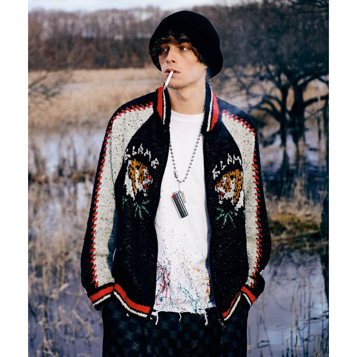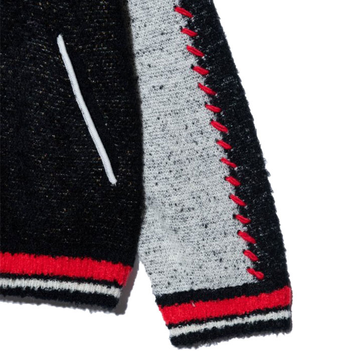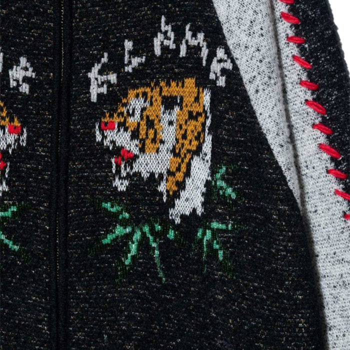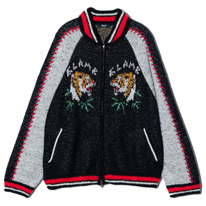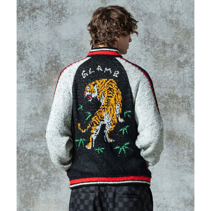“Dance in Hidden Valley”をコレクションテーマに日常と幻想が混濁した世界観を提案する今季のglamb、ブランドアイコンであるスーベニアジャケットを異素材で再構築したKnit Ska Jumper。ラグランスリーブのボディにオリエンタル柄をあしらったデザインはスカジャンパーの定番ながら、テキスタイル使いをサテン生地からニットに変更。虎柄はジャガード、ブランドロゴと笹の柄はブランドが信頼を寄せるファクトリーが時間を贅沢に使った手仕事で取り付けたビーズ、アームにはパイピングを模して太糸ステッチを施すなどアイデアある表現を随所にちりばめました。シルエットは身幅と着丈の双方をコンパクトにまとめたジャストフィッティング。アウターとしての着用に加え、さらにコートやブルゾンを合わせたWアウターレイヤードもお楽しみいただけます。