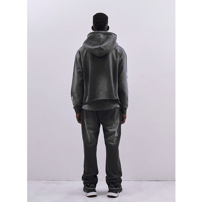 ショート丈のシルエットとハーフジップ仕様が特徴で、大ぶりのフードにはドローコードを採用。