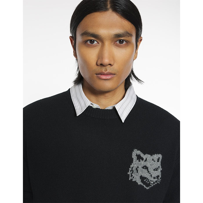 MAISON KITSUNE メゾンキツネ / FOX HEAD INTARSIA MERINO JUMPER (black x medium grey melange)