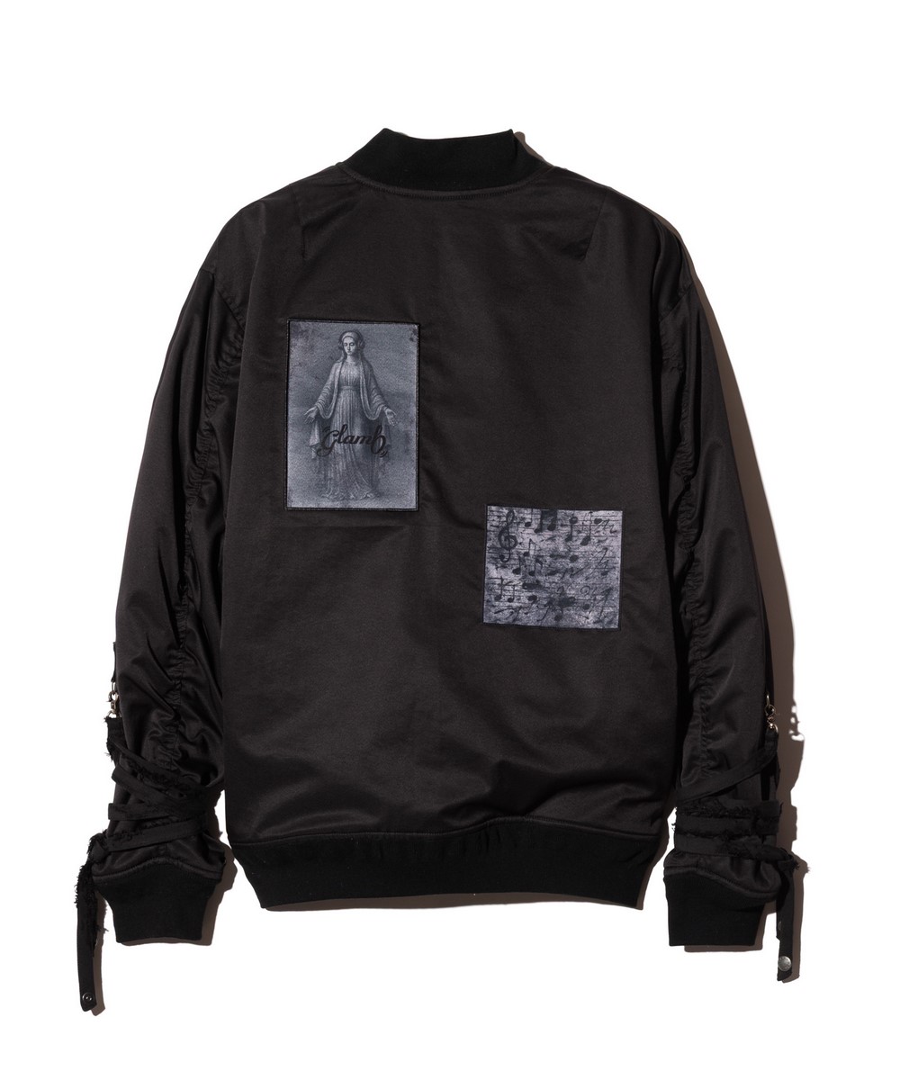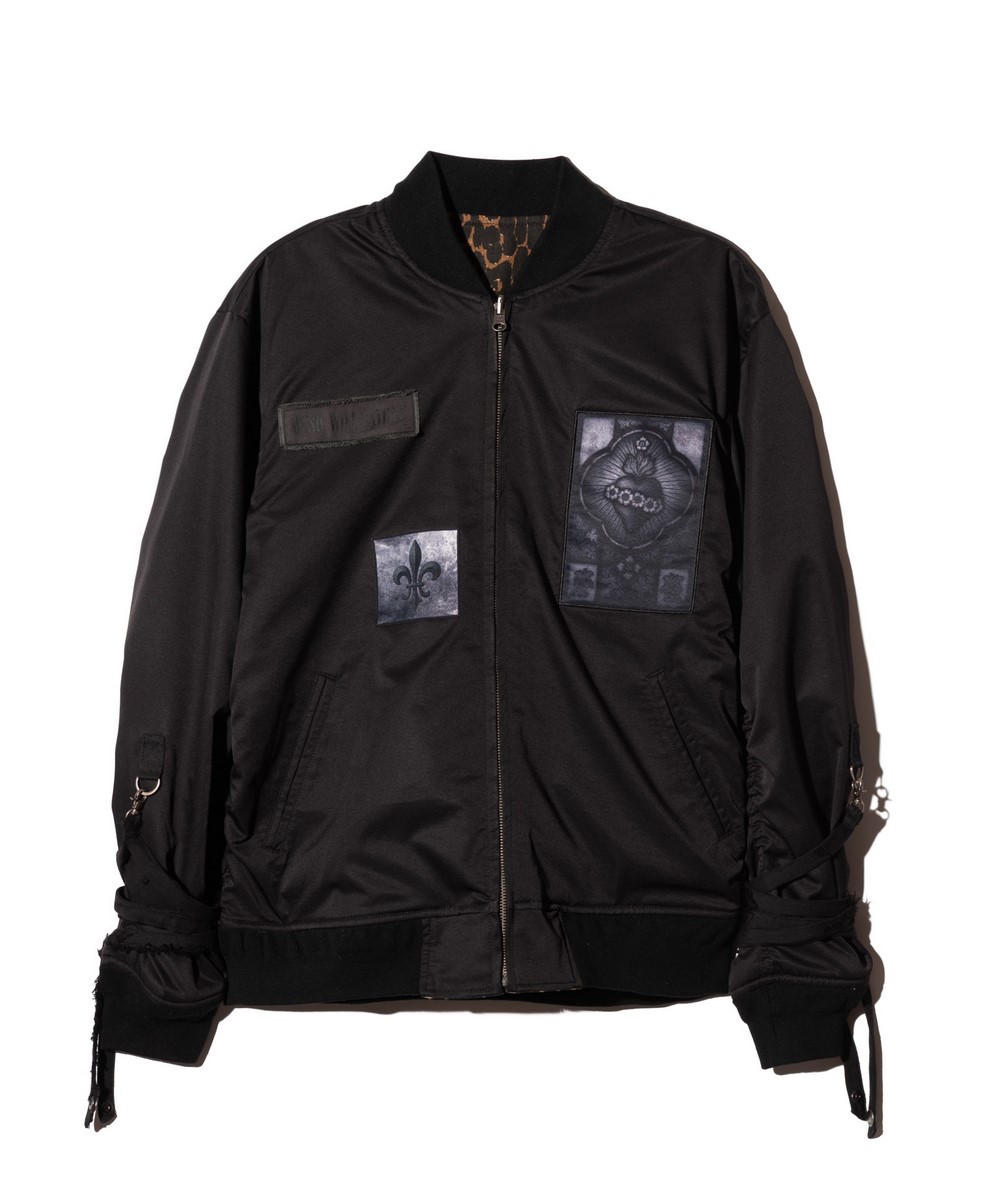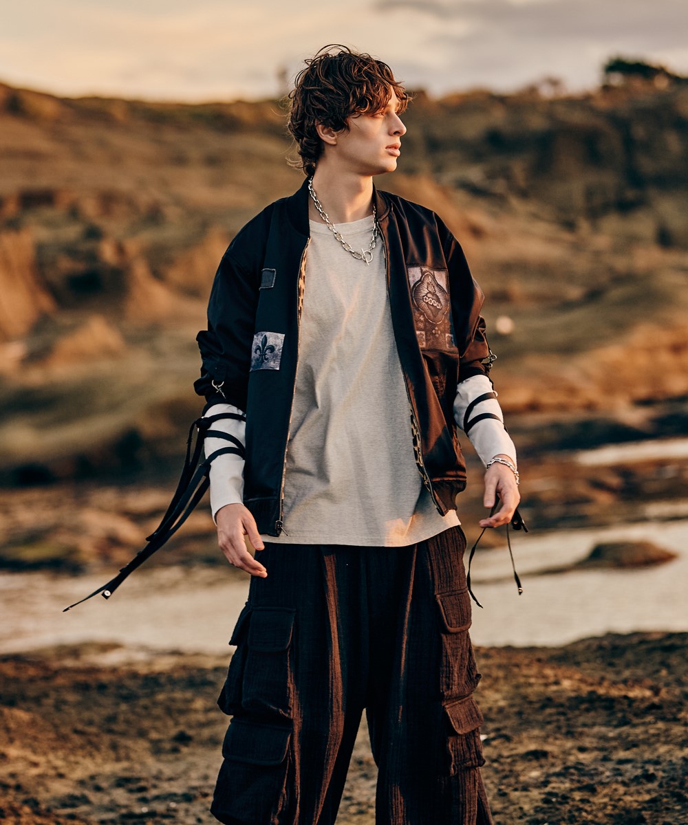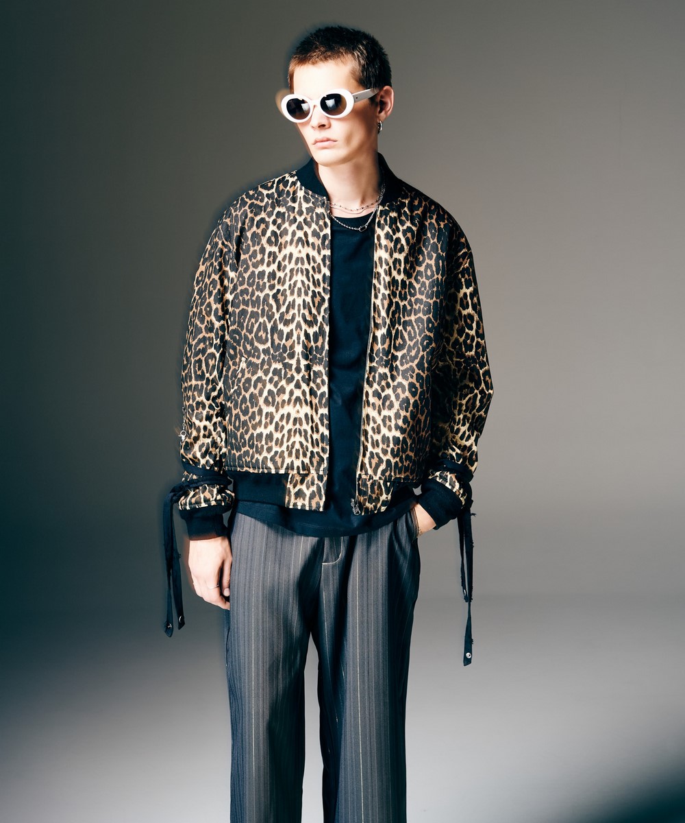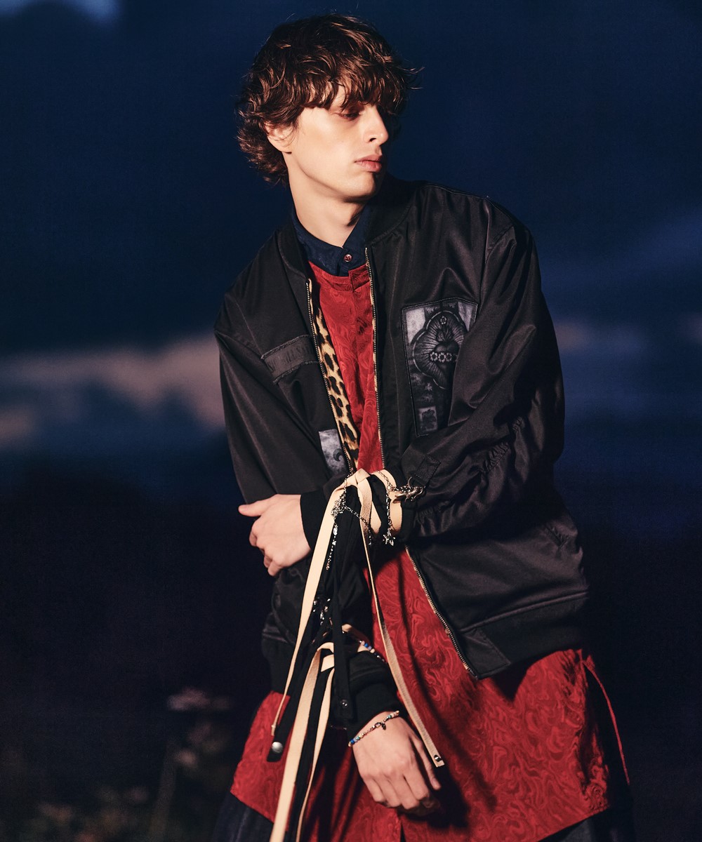 “Shadow of the Wind”をコレクションテーマに掲げた今季のglambのリリカルな世界観をミリタリーウェアに掛け合わせたBlow Reversible Bomber Jacket。ワイドシルエットのボディは宗教画や紋章の当て布を身頃の前後にパッチ。柄の中には音楽にまつわるモチーフをさりげなく隠し込んだglambらしいグラフィックワークが発揮されています。そこにあしらわれた今季のシーズンディテールが左右の袖口のDカンに繋がれるロングテープ。袖口に巻き付けたボンデージ的なアレンジもブランドからの提案です。逆面にはカラーバリエーションごとに異なるテキスタイルを使用。総柄使いのLeopardとCamoに加え、立体的なフリンジがランダムに覗くBlackもラインナップします。ボディはリバーシブルとなっており、袖口のDカンも両面に用意。ボディの2WAYとロングテープのアレンジを掛け合わせ、幅広いスタイリングを形作ることのできる1着となっております。
