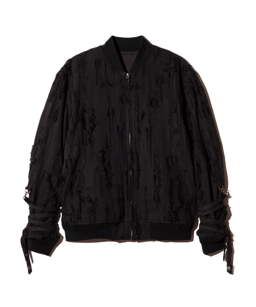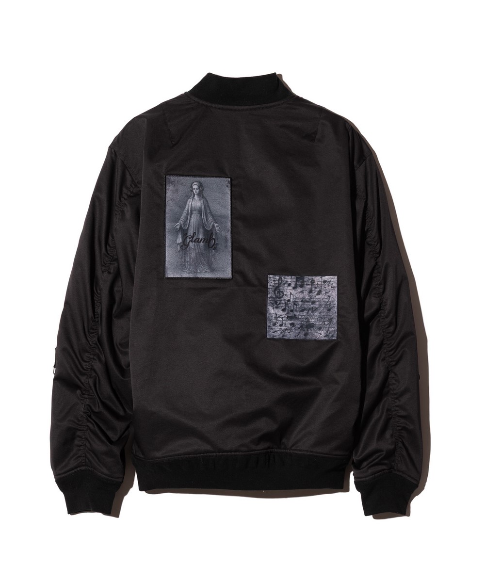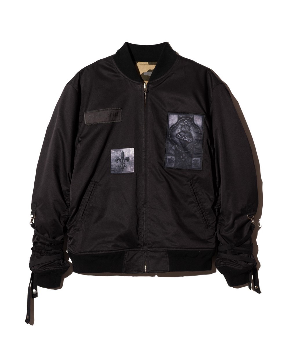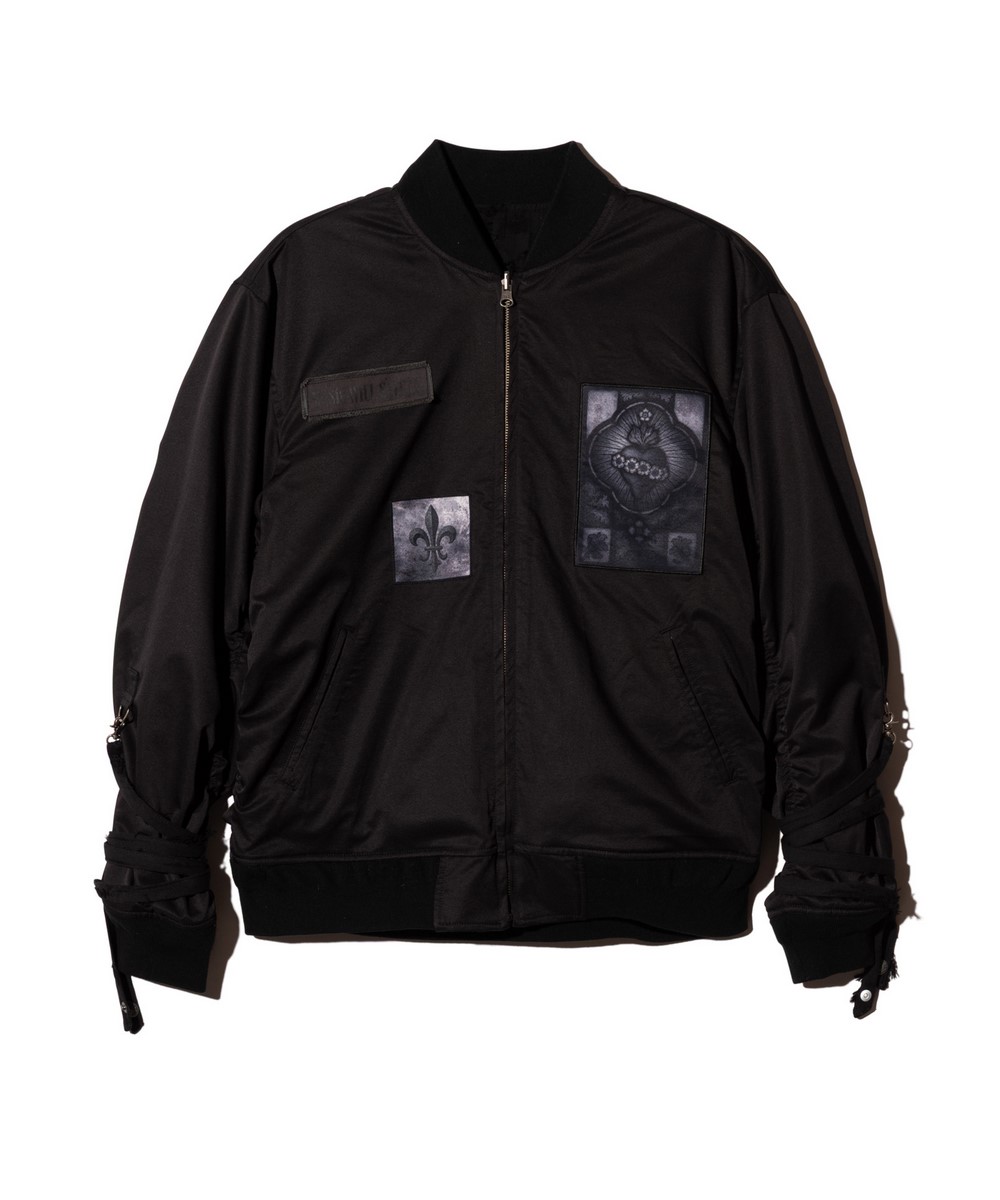 “Shadow of the Wind”をコレクションテーマに掲げた今季のglambのリリカルな世界観をミリタリーウェアに掛け合わせたBlow Reversible Bomber Jacket。ワイドシルエットのボディは宗教画や紋章の当て布を身頃の前後にパッチ。柄の中には音楽にまつわるモチーフをさりげなく隠し込んだglambらしいグラフィックワークが発揮されています。そこにあしらわれた今季のシーズンディテールが左右の袖口のDカンに繋がれるロングテープ。袖口に巻き付けたボンデージ的なアレンジもブランドからの提案です。逆面にはカラーバリエーションごとに異なるテキスタイルを使用。総柄使いのLeopardとCamoに加え、立体的なフリンジがランダムに覗くBlackもラインナップします。ボディはリバーシブルとなっており、袖口のDカンも両面に用意。ボディの2WAYとロングテープのアレンジを掛け合わせ、幅広いスタイリングを形作ることのできる1着となっております。