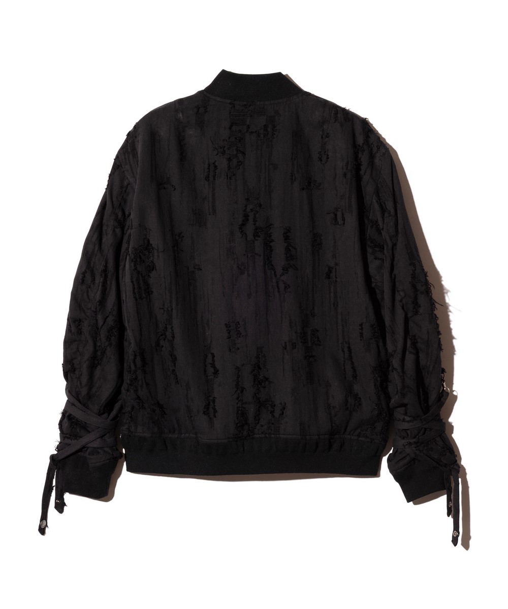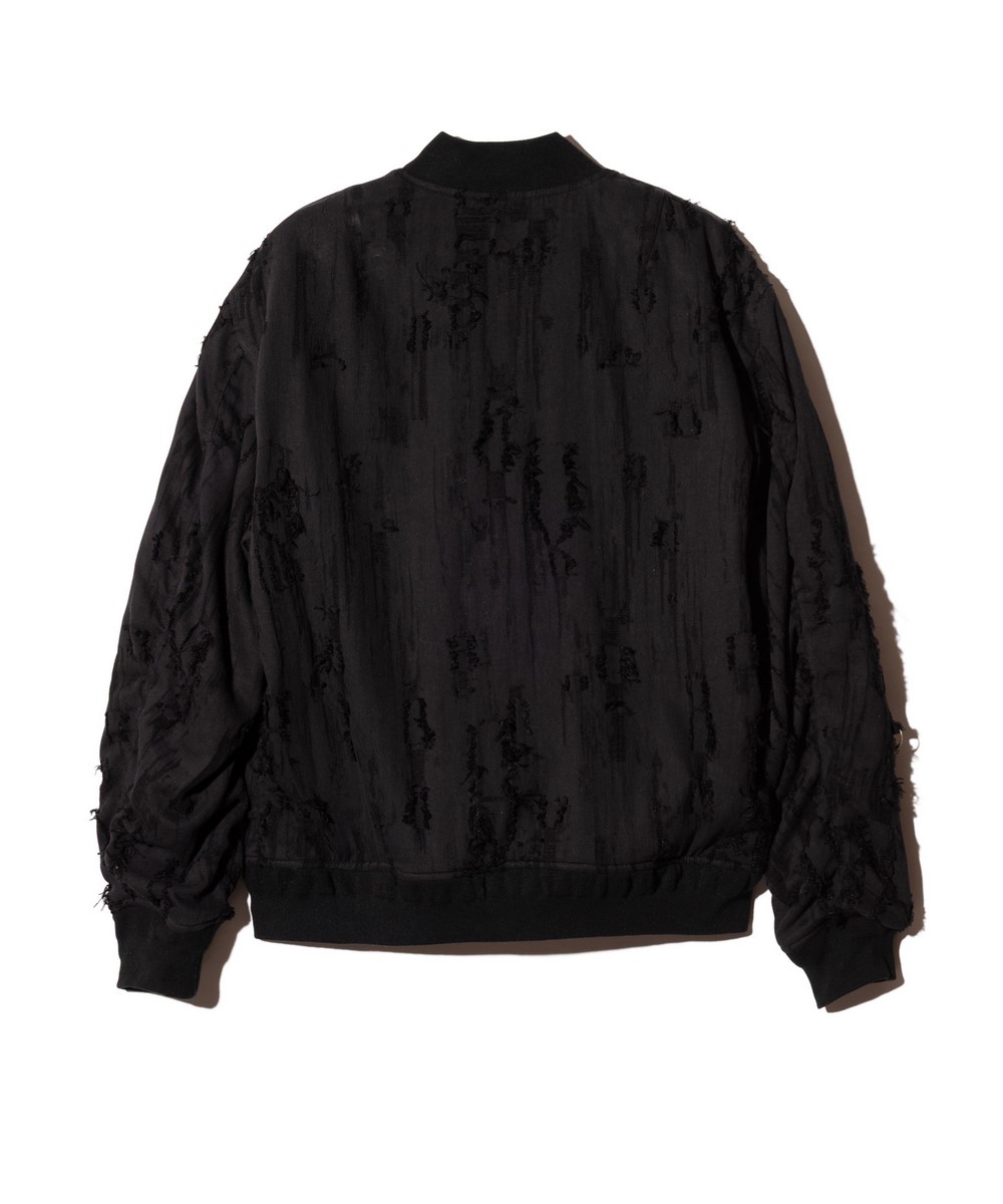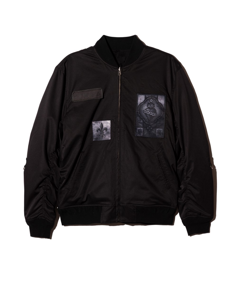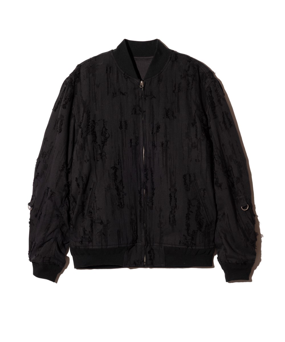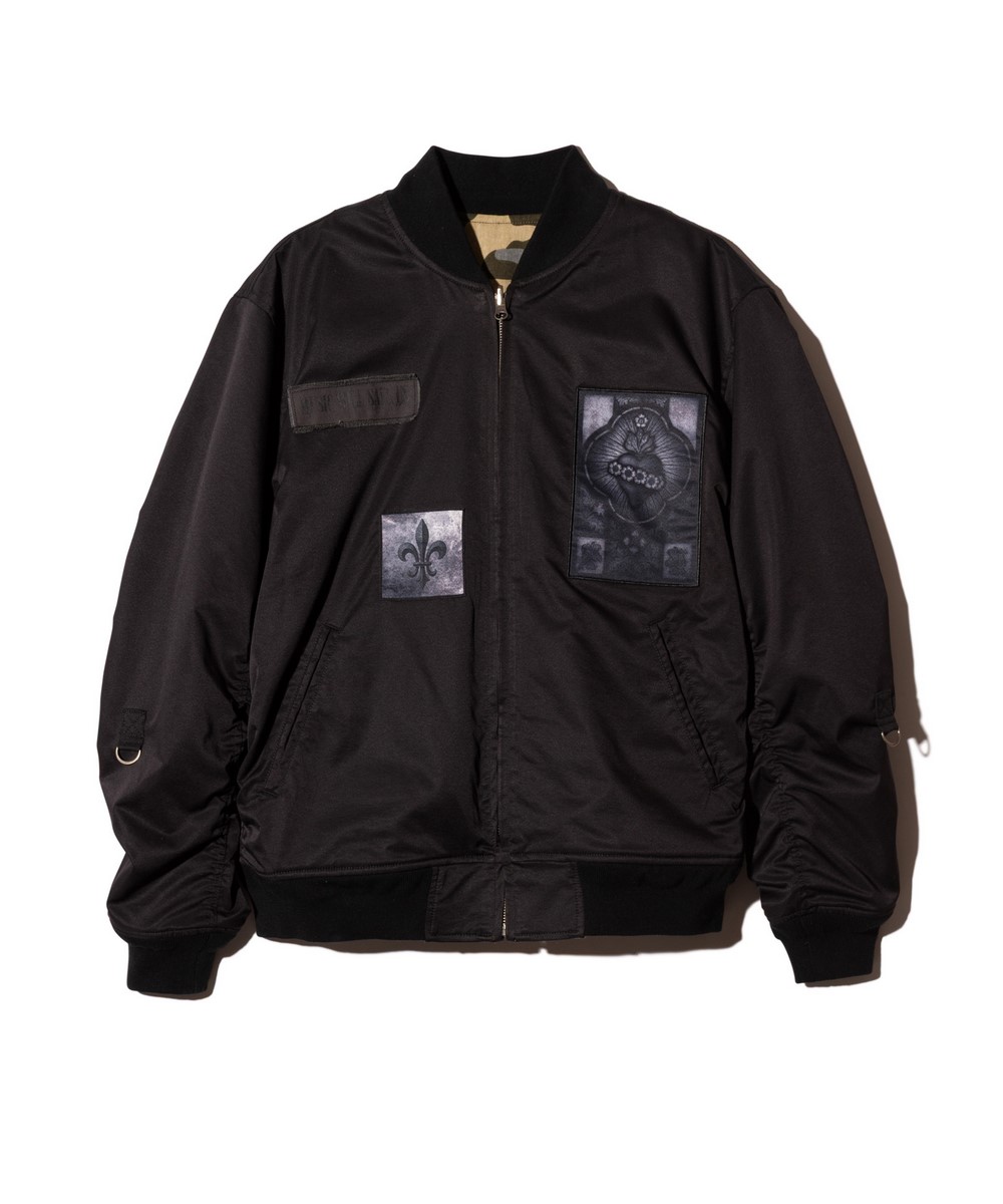 “Shadow of the Wind”をコレクションテーマに掲げた今季のglambのリリカルな世界観をミリタリーウェアに掛け合わせたBlow Reversible Bomber Jacket。ワイドシルエットのボディは宗教画や紋章の当て布を身頃の前後にパッチ。柄の中には音楽にまつわるモチーフをさりげなく隠し込んだglambらしいグラフィックワークが発揮されています。そこにあしらわれた今季のシーズンディテールが左右の袖口のDカンに繋がれるロングテープ。袖口に巻き付けたボンデージ的なアレンジもブランドからの提案です。逆面にはカラーバリエーションごとに異なるテキスタイルを使用。総柄使いのLeopardとCamoに加え、立体的なフリンジがランダムに覗くBlackもラインナップします。ボディはリバーシブルとなっており、袖口のDカンも両面に用意。ボディの2WAYとロングテープのアレンジを掛け合わせ、幅広いスタイリングを形作ることのできる1着となっております。