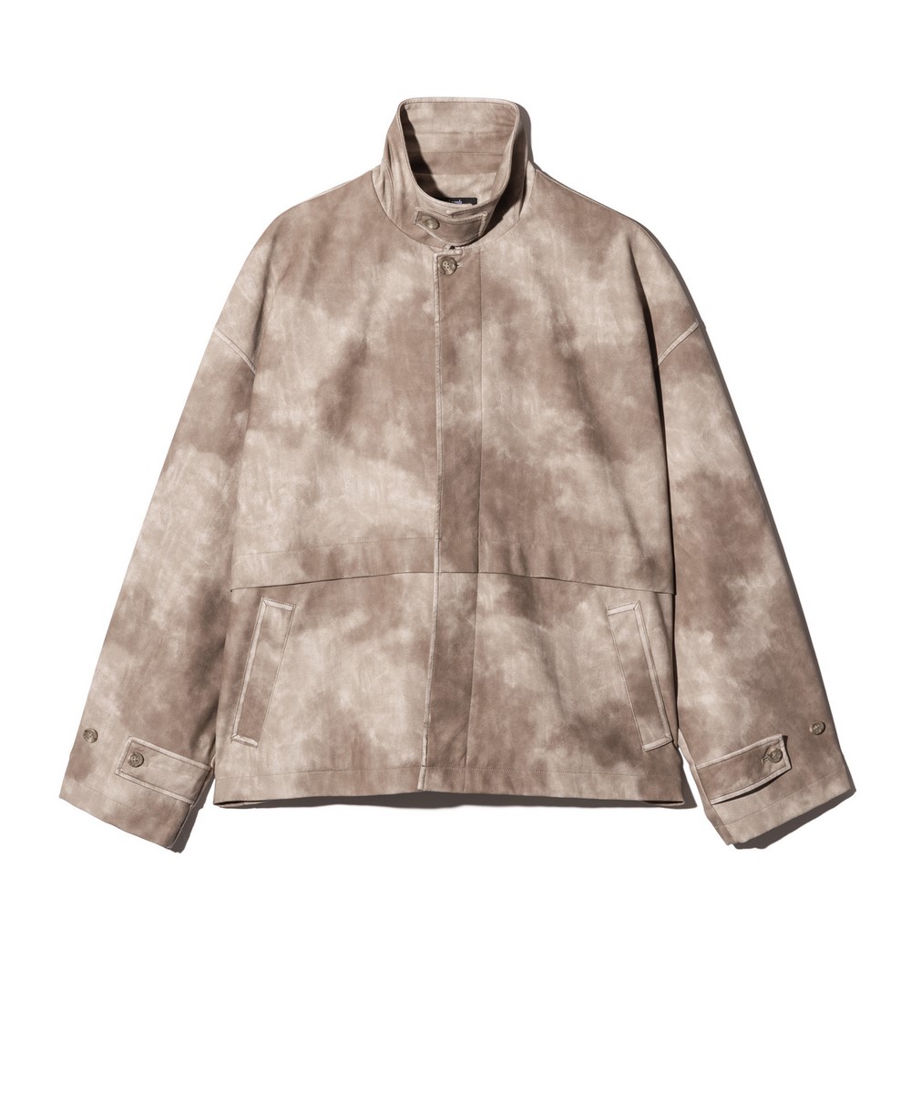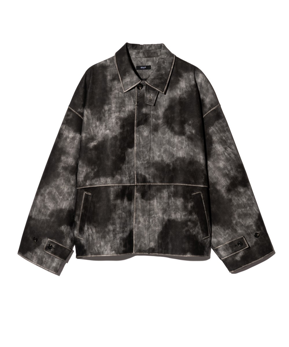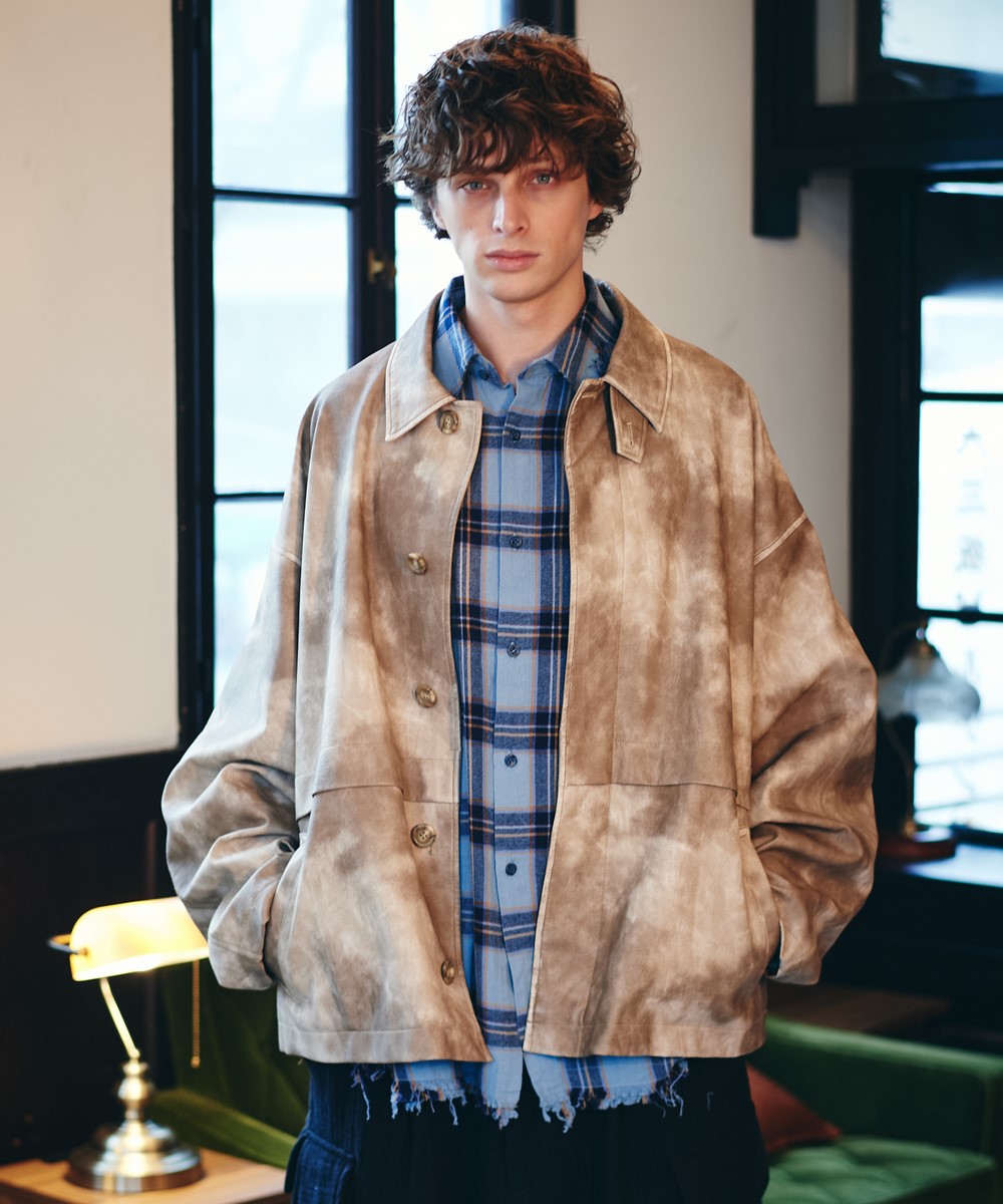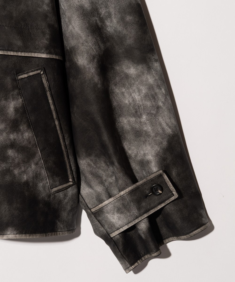 オーバーサイズのレザーブルゾンにウィットあるテクスチャを掛け合わせたOversize Synth Leather Blouson。テキスタイルに用いたのはワイルドなシボ感とムラあるカラーリングが個性を放つシンセティックレザー。仕上げに袖口などのエッジは手作業による薬剤の擦りを加えてアタリを刻んで本革さながらの質感を持たせつつ、防水性や防汚性といったデイリーユースに使い勝手のいい特性も兼ね揃えます。身幅と袖幅それぞれに非常にゆとりを設けたオーバーサイズのボディは、その輪郭を強調するよう前身頃は第一ボタンのみを覗かせた比翼仕立て。首元のチンストラップや袖口の2つボタン仕様など、スタイリングにアレンジを加えるディテールも随所に加えています。