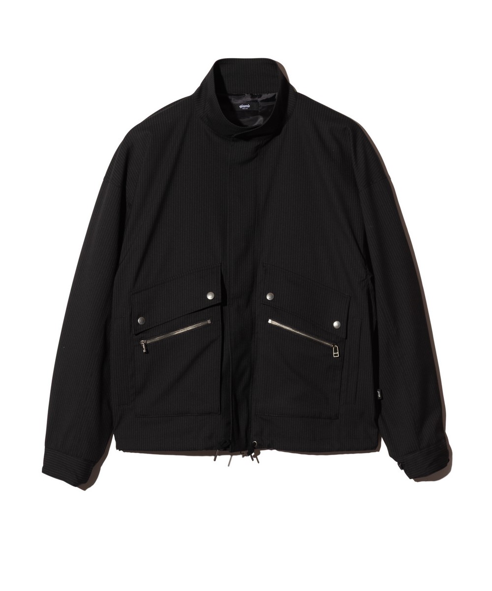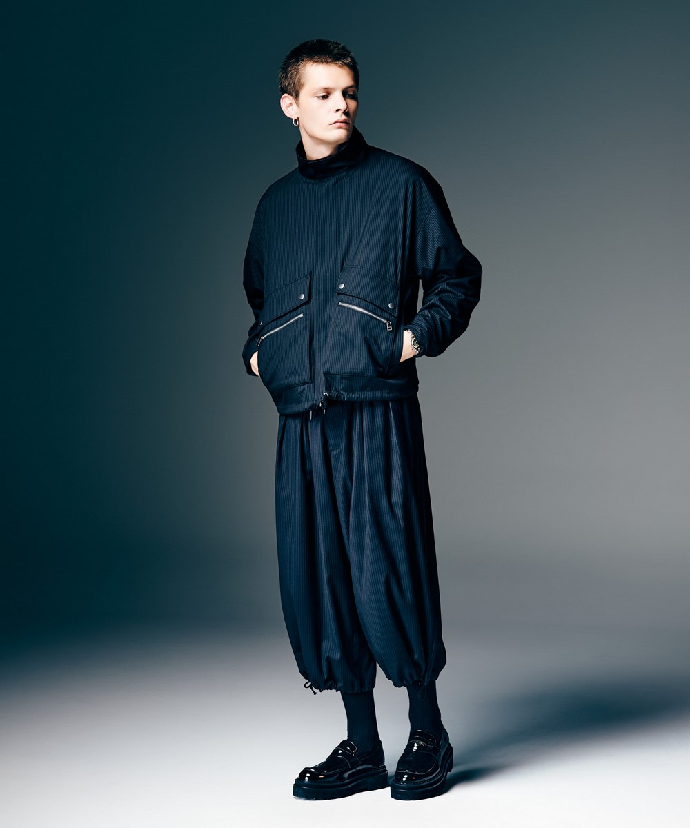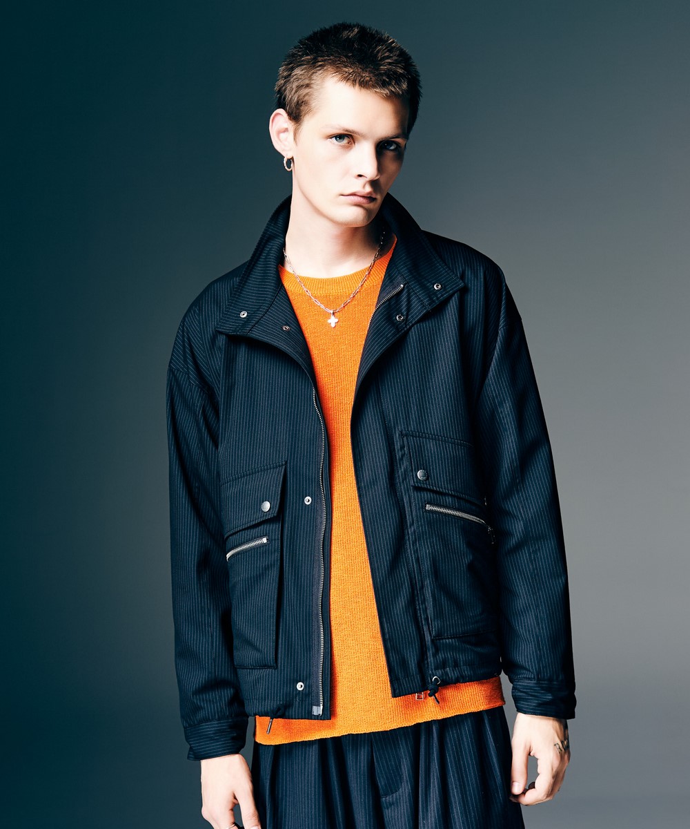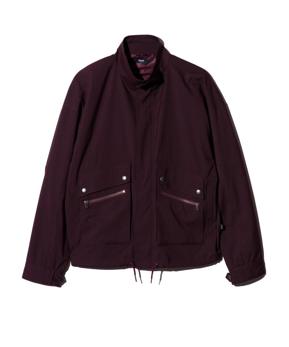 ミニマルなボディの中にエッジィなディテール使いを効かせ、glambならではのベーシックスタイルを提案するDouble Pocket Blouson。テキスタイルに用いたのはレーヨン混の落ち感ある質感とクラシカルなストライプ柄が特徴のストレッチ生地。着回しを選ばないレギュラーシルエットのボディに、リベットやジップでメタルの質感を強調したWポケットをあしらうことでエッジィなムードを演出。裾にあしらわれたドローコードの調整でシルエットをさらにソリッドにアレンジすることも可能となっています。