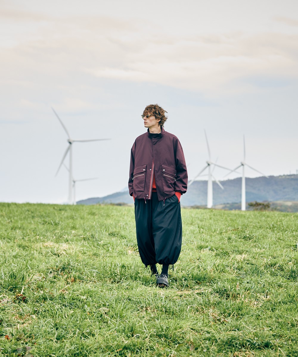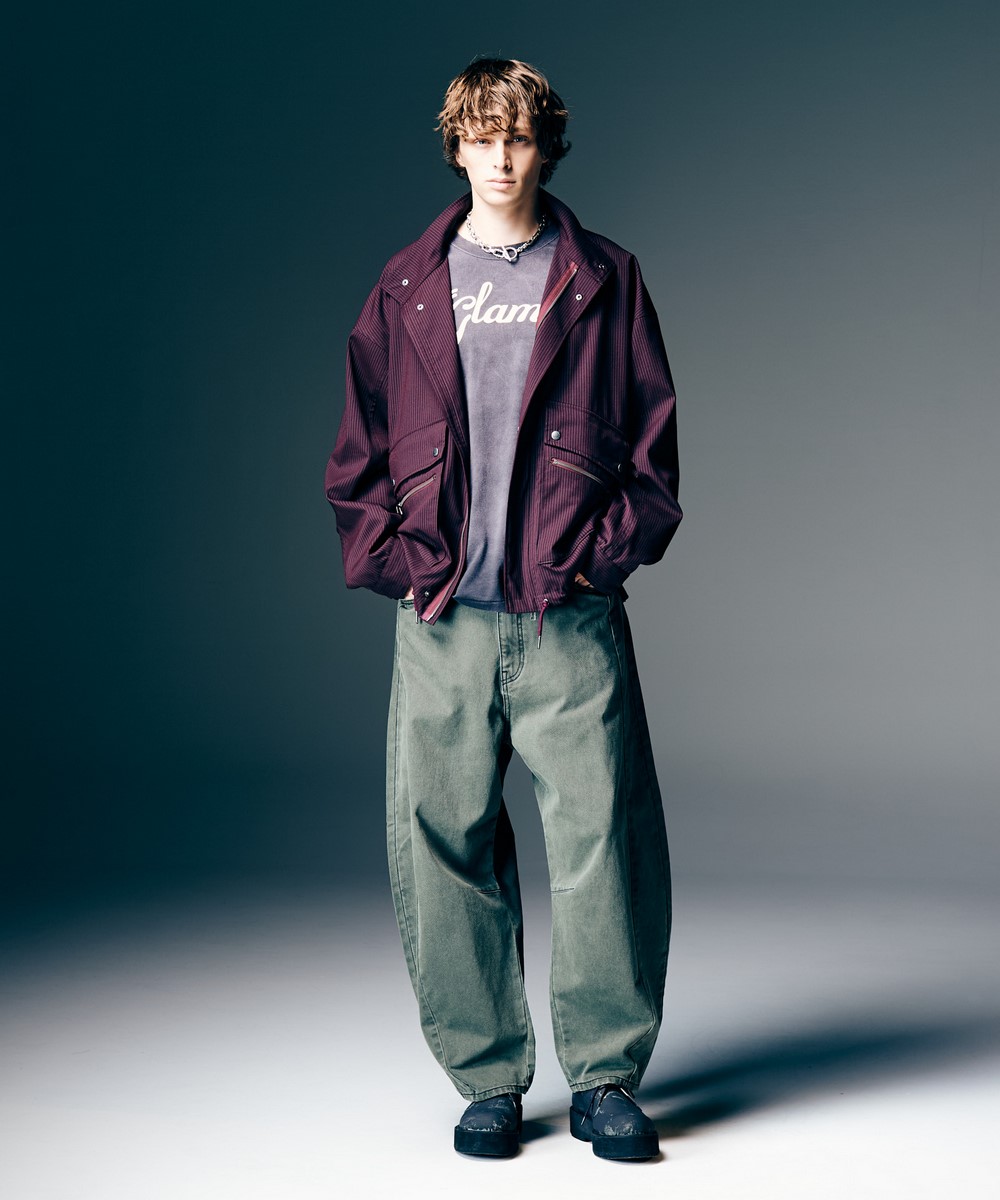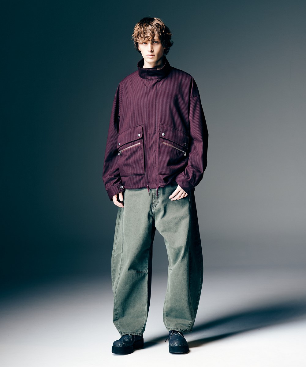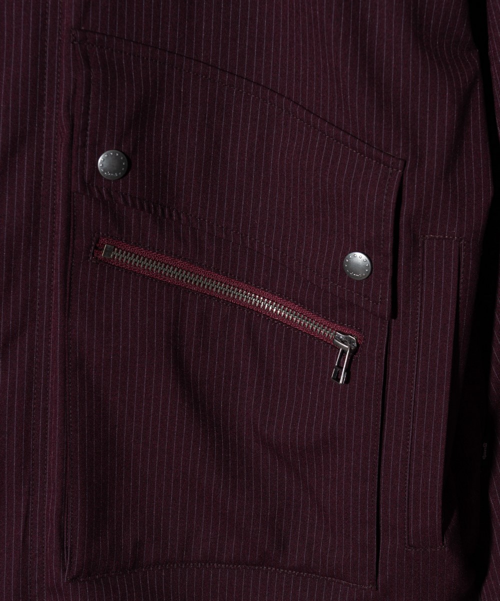 ミニマルなボディの中にエッジィなディテール使いを効かせ、glambならではのベーシックスタイルを提案するDouble Pocket Blouson。テキスタイルに用いたのはレーヨン混の落ち感ある質感とクラシカルなストライプ柄が特徴のストレッチ生地。着回しを選ばないレギュラーシルエットのボディに、リベットやジップでメタルの質感を強調したWポケットをあしらうことでエッジィなムードを演出。裾にあしらわれたドローコードの調整でシルエットをさらにソリッドにアレンジすることも可能となっています。