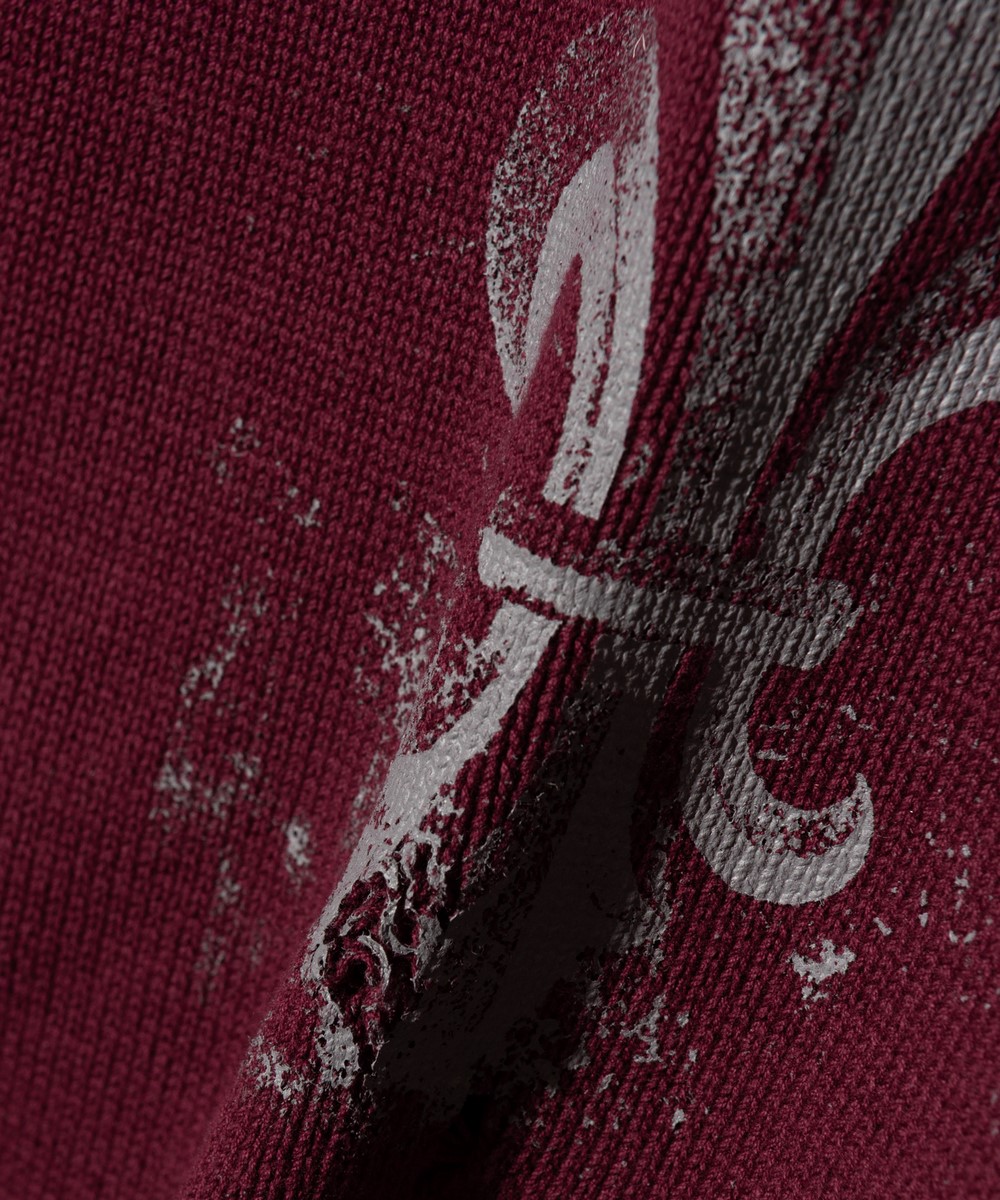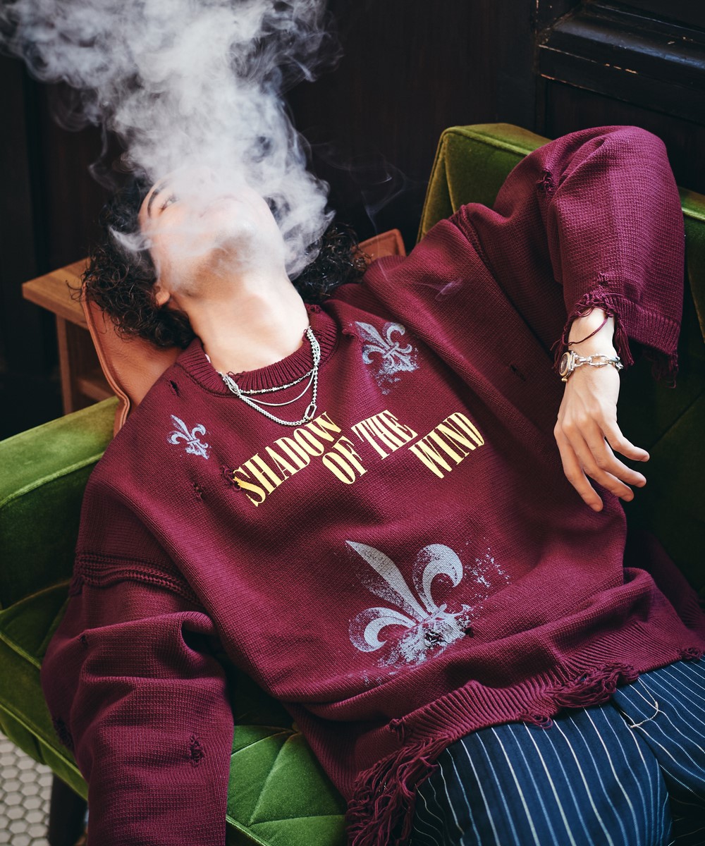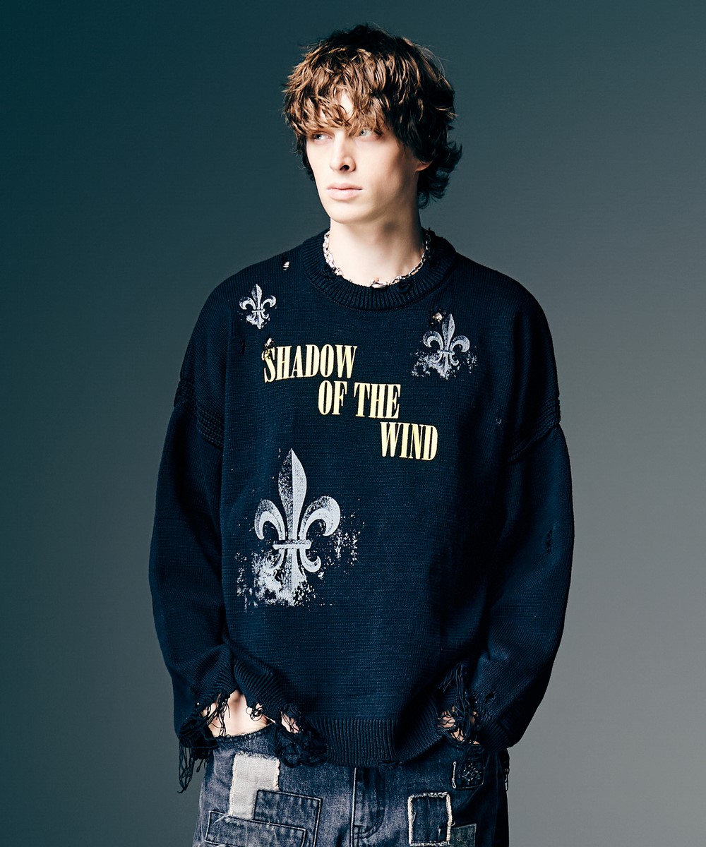 “Shadow of the Wind”をテーマに掲げて世界の光と陰をワードローブに描き出す今季、プルオーバーニットにギャップあるデザインを落とし込んだSacred Damage Knit。ボディの柄使いは百合の紋章をあしらったクラシカルなものながら、その要所へハードなダメージ加工。紋章自体もかすれの表現を加えることで貴族的なモチーフとストリートのミクスチャーを生み出しています。素材に用いたのはコットン100%の双糸。ボディは天竺編み、首周りと袖口、裾はリブ編み、アームホールは片畦編みとニットならではのテクスチャ変化も魅力です。