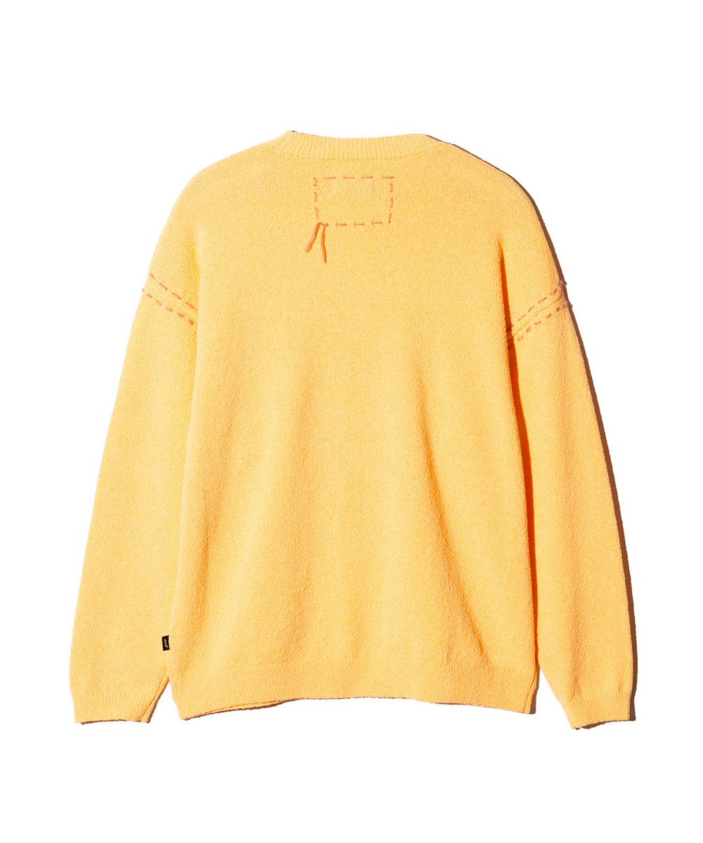 シンプルなプルオーバーニットにクラフトマンシップが息づくHand Beaded Logo Knit。着丈を短めに設けたビッグシルエットのボディは、空気を含みふっくらとした質感のブークレ糸を天竺編みした優しい肌触りが特徴。その胸元に落書き調の輪郭でブランドロゴをビーズ刺繍しました。アームホールは甘い撚りにより温かみある風合いを持つローピング糸でハンドステッチ。バックスタイルでもタグをかたどるように同様のステッチを施し、敢えて糸を垂らすことでグランジのニュアンスを添えました。