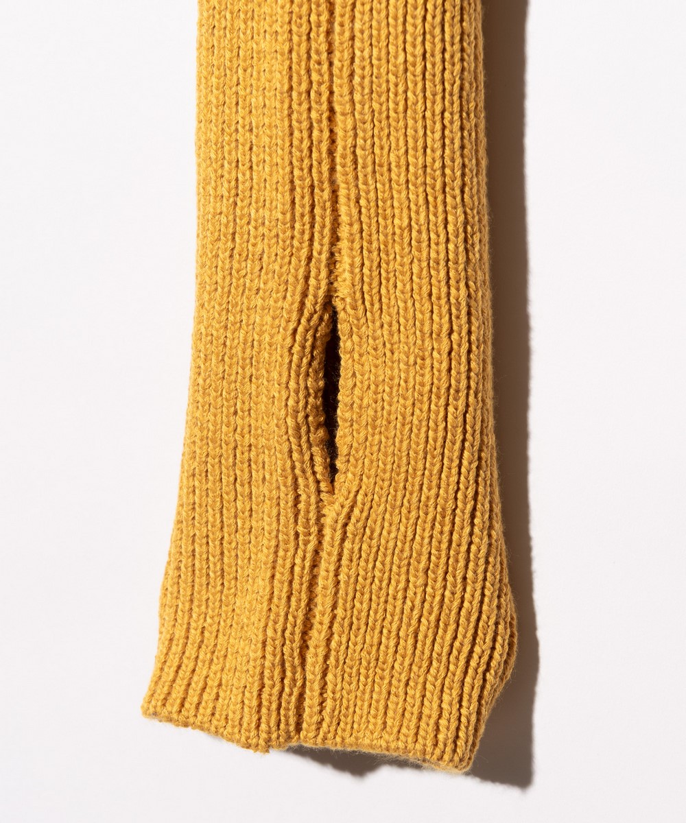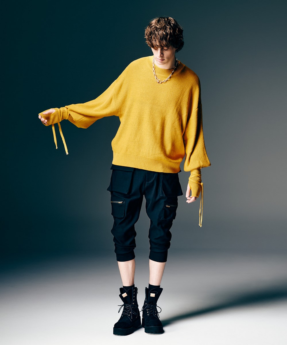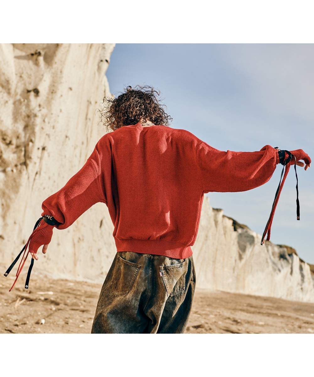 緩急あるシルエットメイキングでプルオーバーニットを再構築したCreed Knitが今季ならではの意匠を備えて登場。ミドルゲージの天竺裏目使いで仕立てたボディは従来よりもショート丈としたボックスシルエット。ロングリブで緩急ある輪郭にまとめたアームは袖口にサムホールを、さらに新たなギミックとしてニットテープを配しました。こちらはそのまま垂らしたり、リブに巻いてロックスタイルにしたりとアレンジが可能。今季のアクセサリーラインで用意されるストラップシリーズ(*)のさらなる重ね付けもブランドからの提案です。