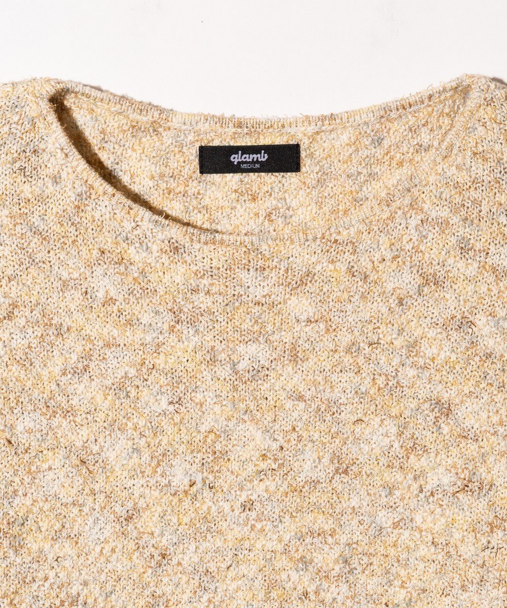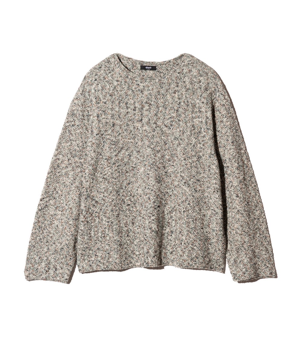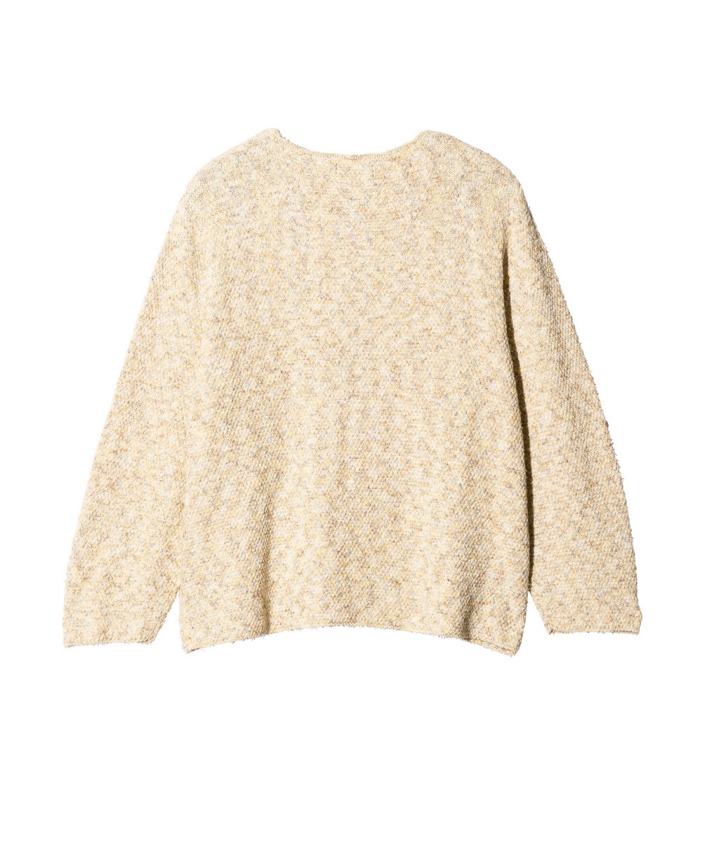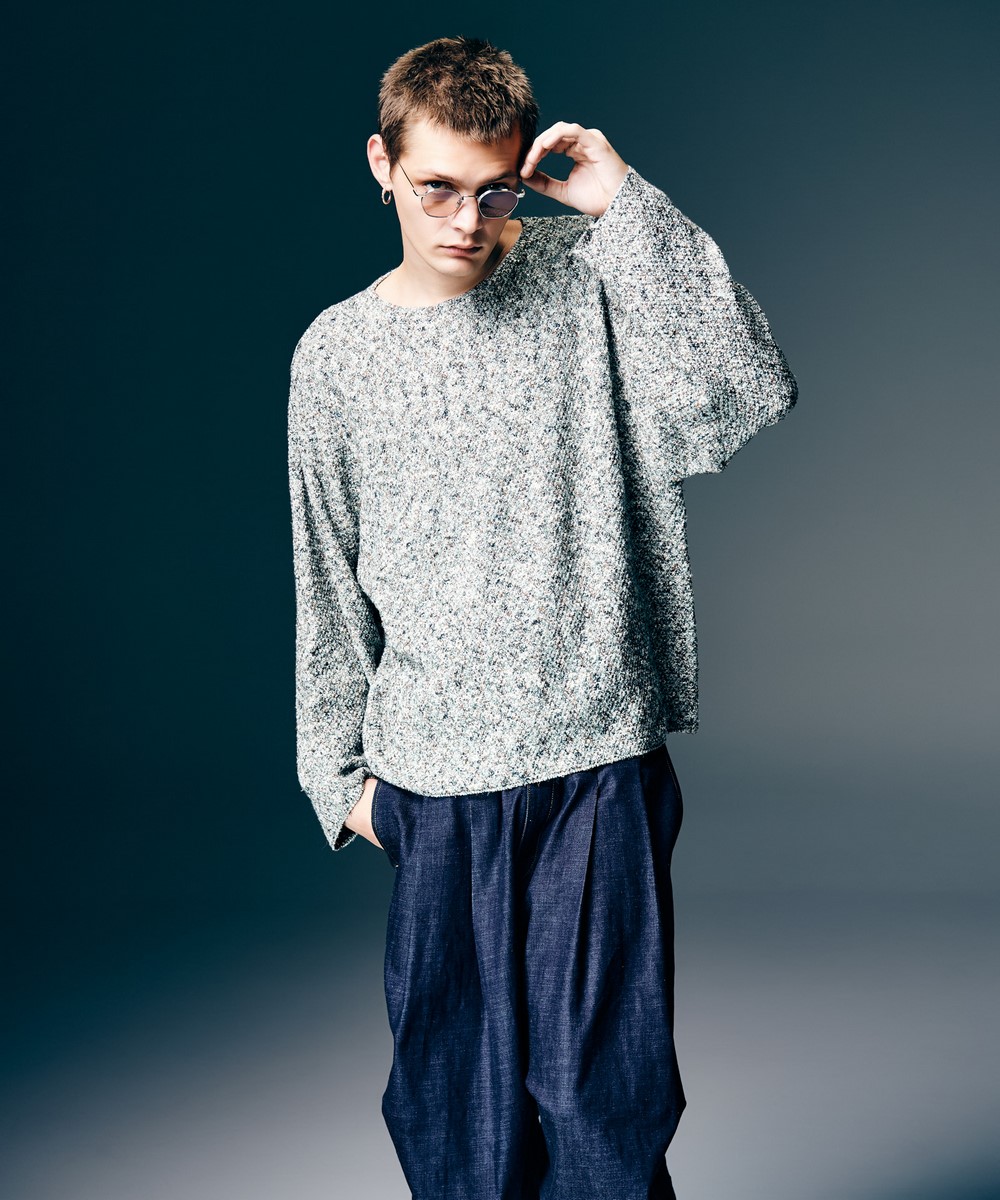 アースカラーの色糸を巧みに組み合わせリラクシングなムードを表現したEarthy Knit。ざっくりとした編地のテクスチャはコットン、アクリル、ナイロンの混紡糸をミドルゲージで鹿の子編みして生み出したもの。糸の厚みが異なるスラブヤーンや撚糸のような糸が奥行きある多彩な表情を浮かべます。シルエットは袖幅と身幅を設けながら、短丈に設定したルーズフィット。リブを排したボートネックと裾もナチュラルな抜け感を演出します。