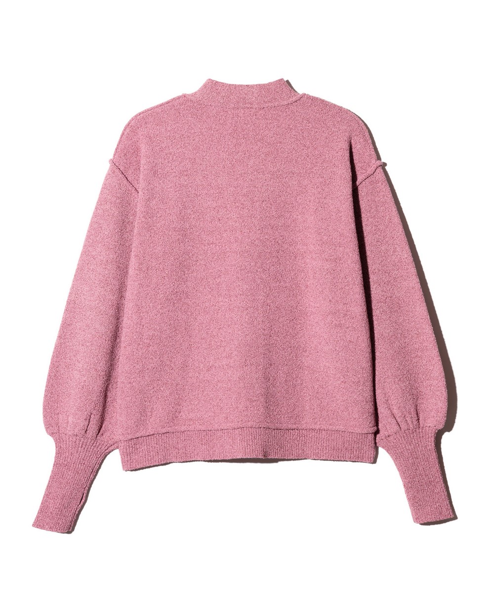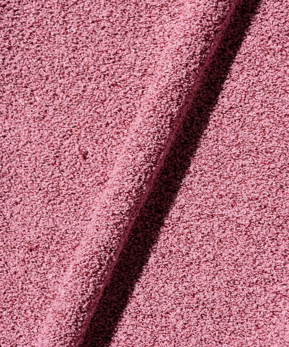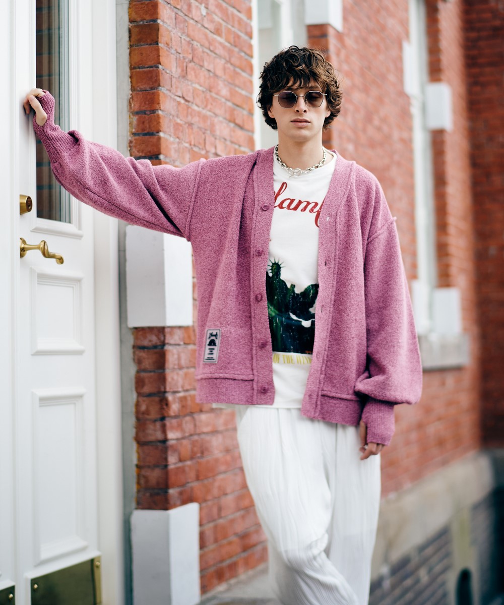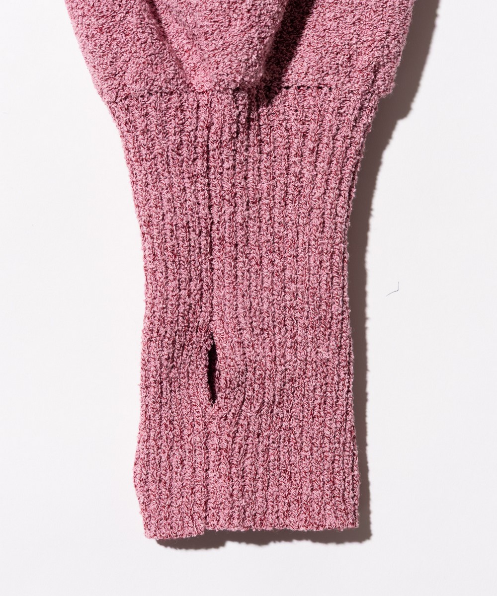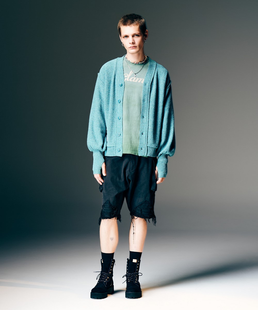 glambの人気シリーズの一つ、Creed Knitのエッセンスをカーディガンに落とし込んだCreed Cardigan。アームにコントラストあるシルエットを描き出すのはサムホールを備えたロングリブの袖口。ワイドな袖が手元に溜まり、エレガントなボリュームを形作ります。アームホールや前立てでは縫い代を表に出して立体感あるテクスチャ変化を描出。右裾にクリア素材のラバータグをあしらってアクセントを添えました。テキスタイルに用いたのは、ドライタッチのブークレ糸をミドルゲージで天竺裏目使いしたマテリアル。糸の輪を表に出すことで独特のラフな質感を見せています。シルエットは着丈短めのルーズフィット。Vネックを浅めに取ることでカジュアルに寄り過ぎないバランスを持たせています。