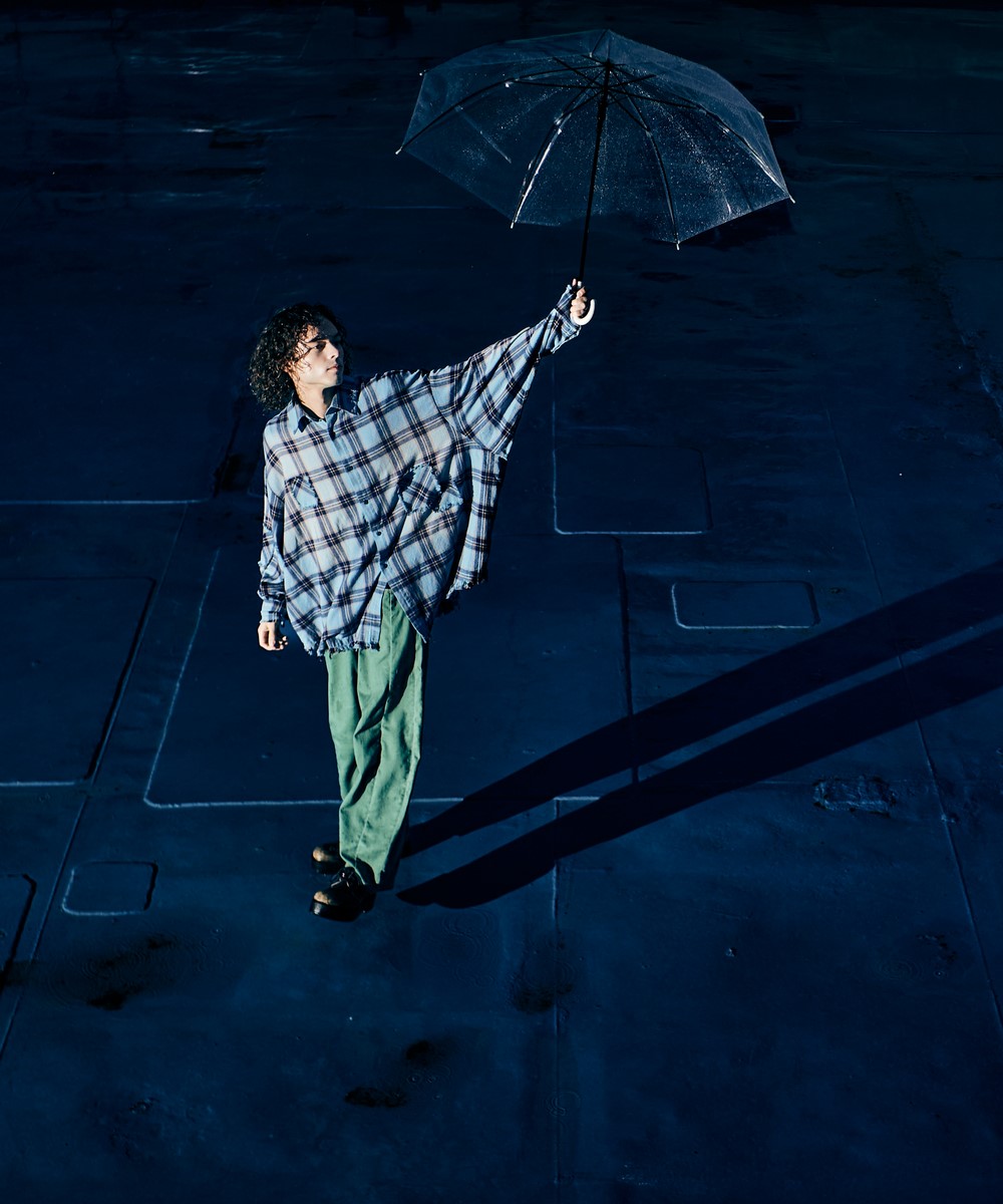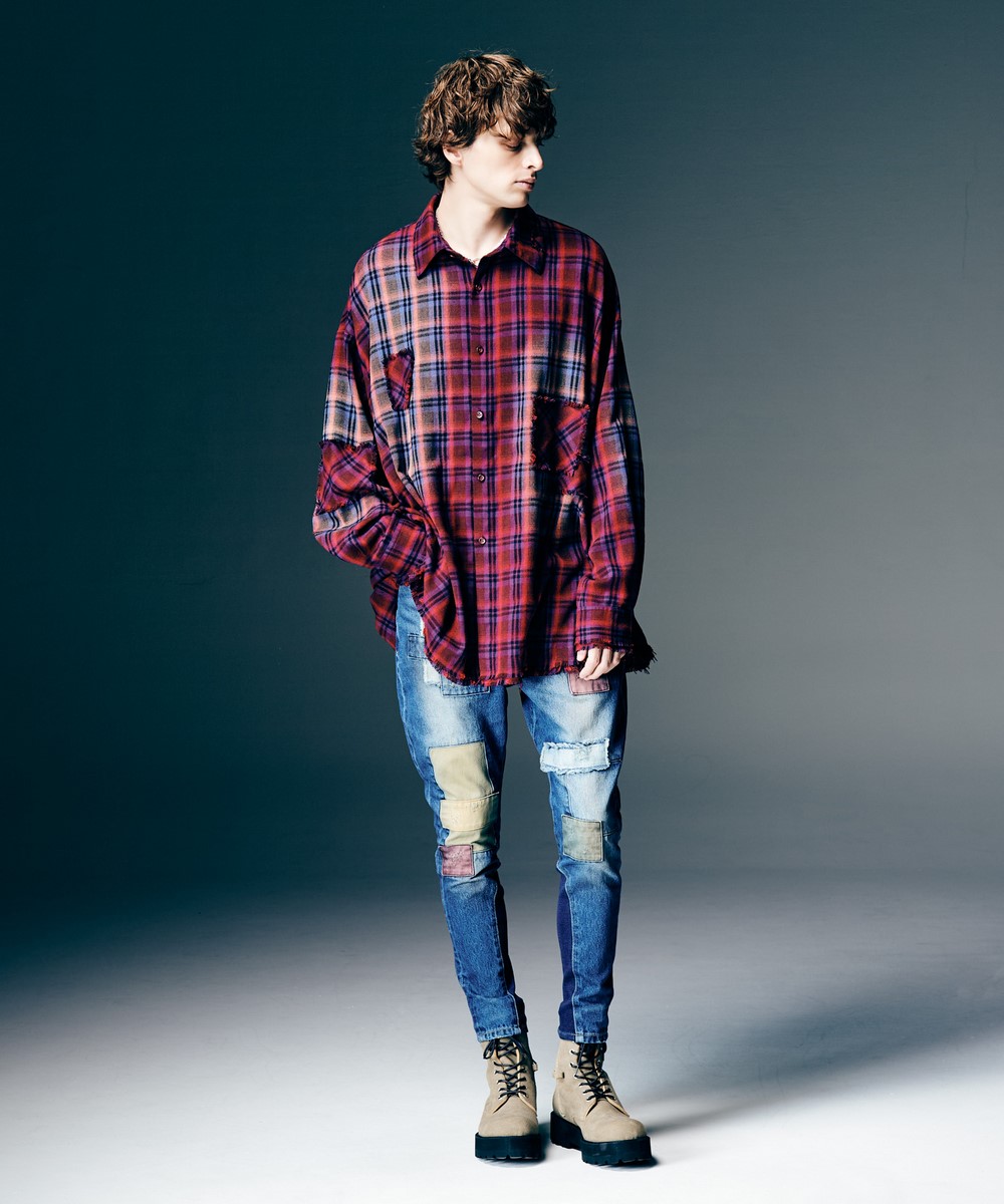 グランジルックを代表するファッションピースであるネルシャツにglambならではのダメージ加工を随所へ施した4XL Flannel Shirt。シルエットは身幅、着丈、袖などすべての寸法をエクストラビッグに設定したオーバーサイジング。フランネル生地を用いたボディは袖口や裾を切りっぱなしで縫製した後、左右の胸元へブリーチ加工を施すことでグランジィな佇まいに。そこへさらにバイアス使いの当て布をあしらって、仕上げにウォッシュ加工。色と素材のそれぞれに幾重もの工程でダメージを刻み、glambの根幹にあるグランジを現在進行形で提案する1枚となっております。