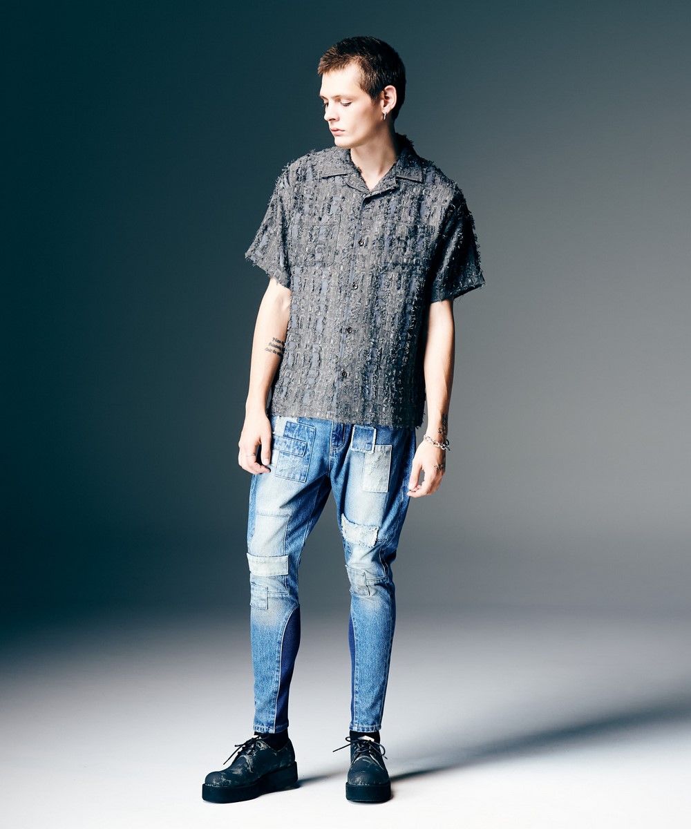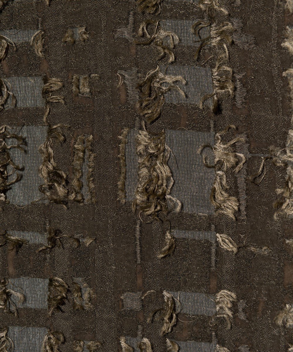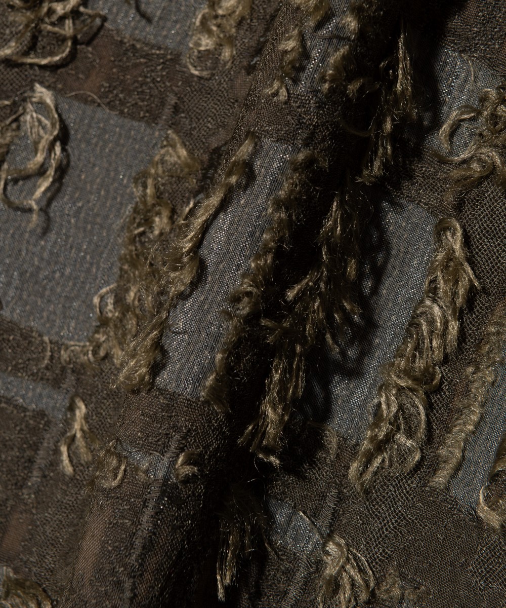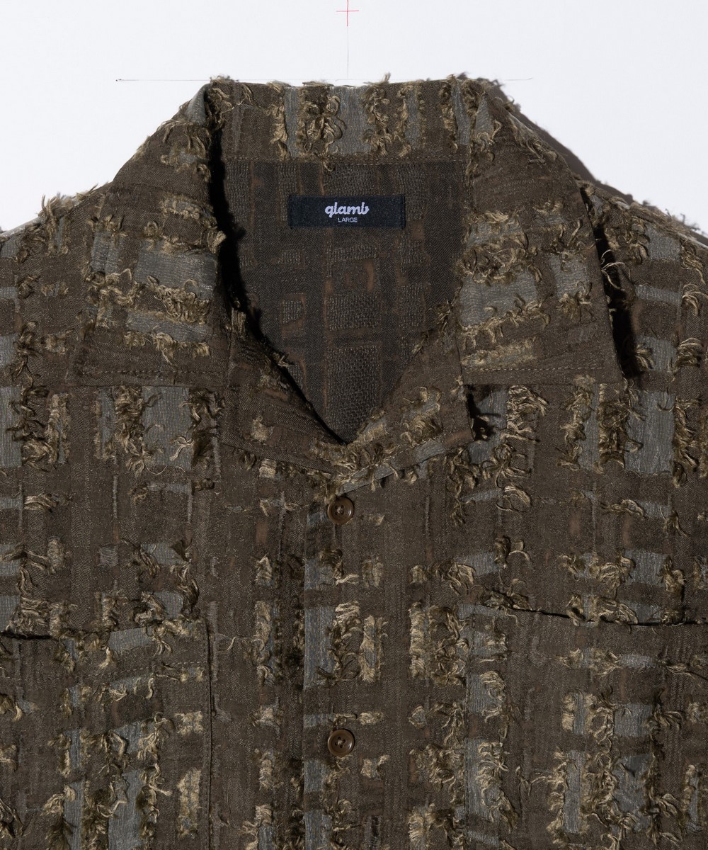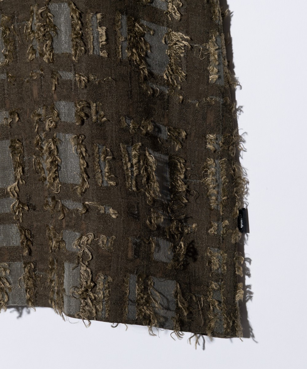 春夏の装いに欠かせないオープンカラーシャツを、ファジーなテキスタイル使いでネオルードに仕上げたFuzzy Check Shirt。身幅と着丈にゆとりを持たせたボックスシルエットのボディに落とし込んだのはアニマルファーのようなフリンジを備えたジャカード生地。チェック状の柄の輪郭に合わせてオーガンジーを挟み込むという大胆なアイデアによって、季節感を捉えた軽さある着心地と重層的なテクスチャを両立しました。