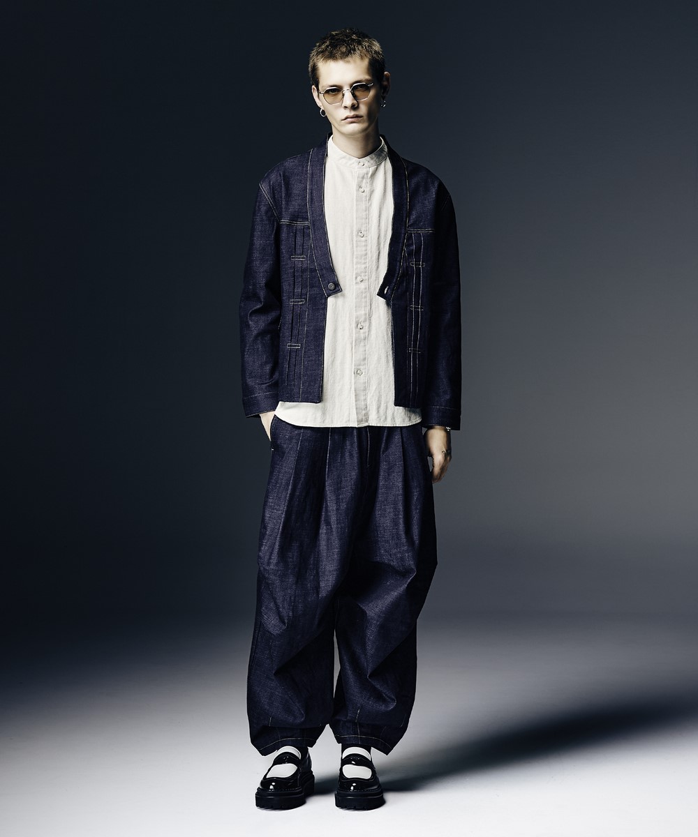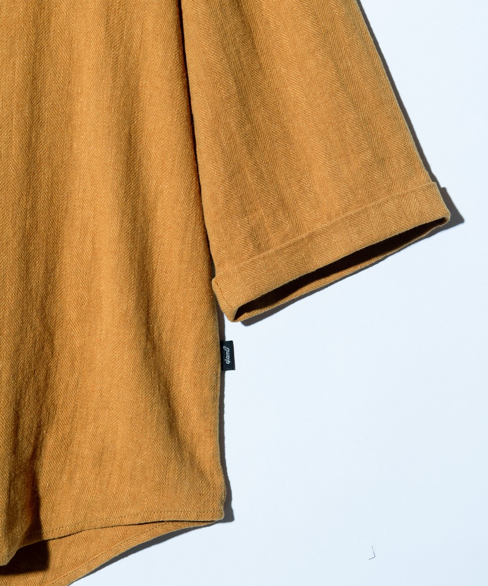 ヴィンテージミリタリーウェアを着想にセレクトしたテキスタイルをミニマルなデザインで提案するStand Collar Shirt。洗練されたスタンドカラーのボディは身幅にゆとりを持たせ、着丈に前後差をつけたオーバーサイズ。ドロップショルダーのアームはレングスを五分袖、袖口をダブル仕様にすることで下側に重心を持たせた変化あるシルエットとなっています。そこに落とし込んだのはシャリ感があり清涼感のある肌触りが魅力となるリネン混ヘリンボーン生地を使用。モックネック調のデザインと相まってリラックスしたアーバンスタイリングを生み出します。