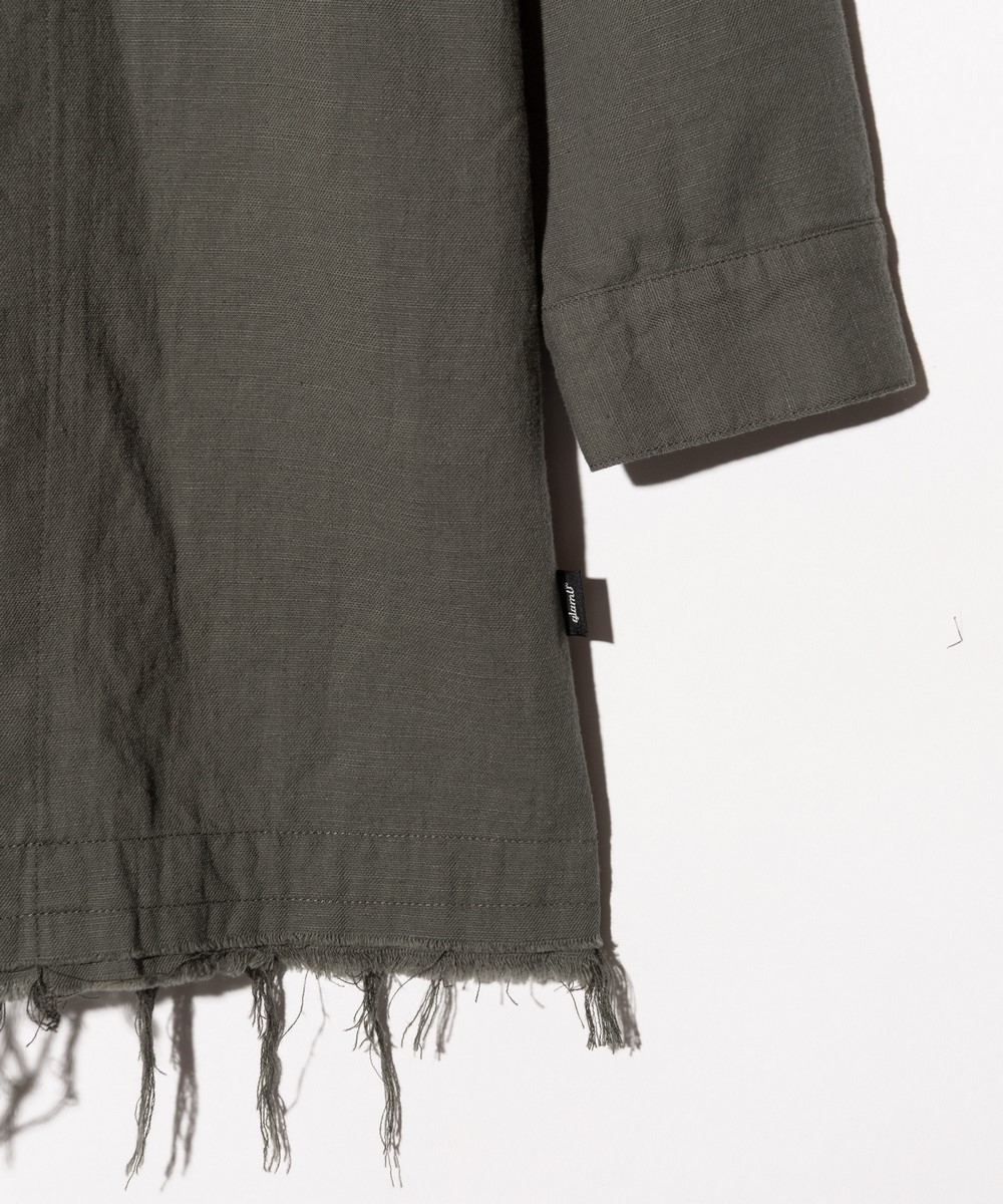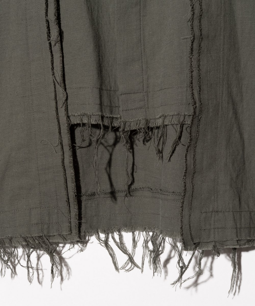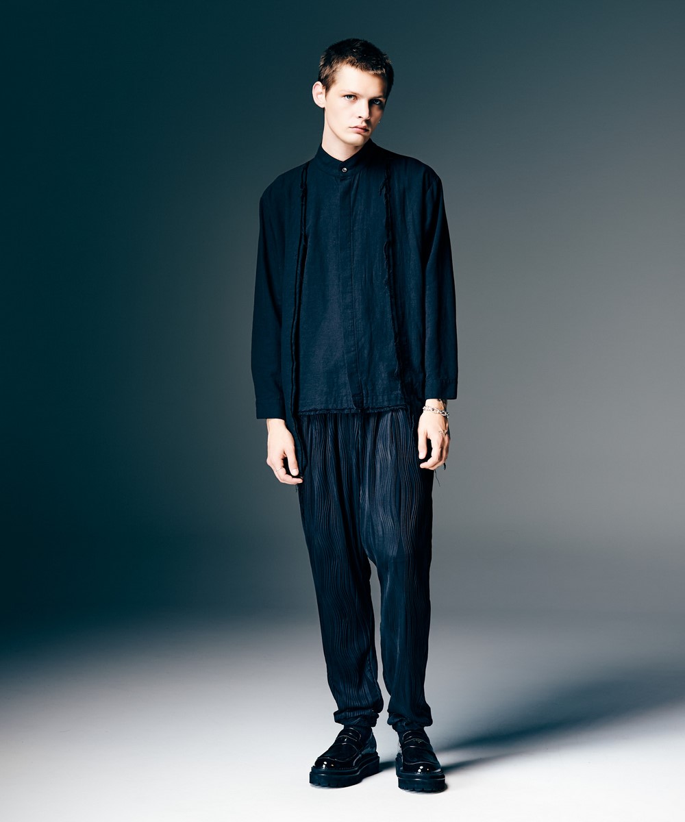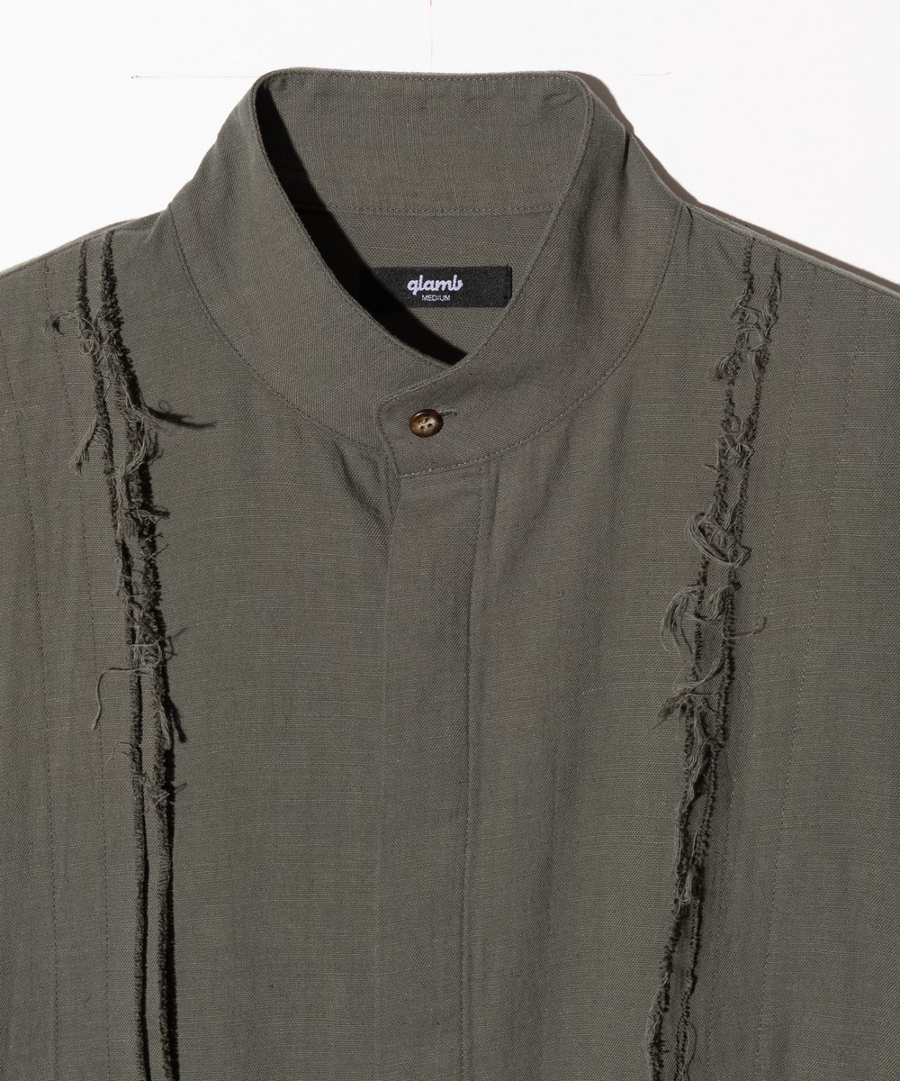 フェイクレイヤードを駆使して季節感を捉えたフォークロアスタイルを提案するLayered Cardigan Shirt。身生地に用いたのはスラブ混リネンコットンの風合い豊かなテキスタイル。着丈と身幅を長く設定したアウターライクなルーズシルエットのボディに、カーディガンタイプのレイヤードパーツを同生地でドッキングすることでボヘミアン調の佇まいを生み出しました。エッジ部分はカットオフで始末した後、仕上げのウォッシュ加工でほつれを演出。glambらしいダメージのニュアンスが放浪者然としたエイジングルックを完成させます。