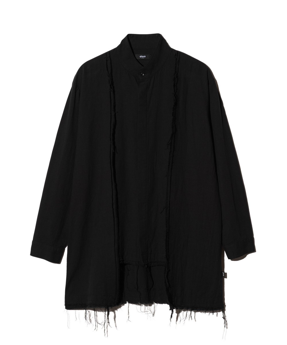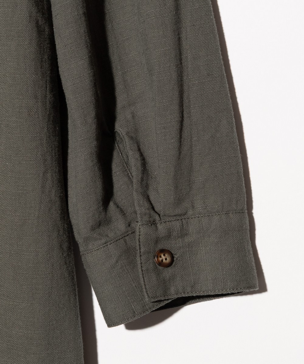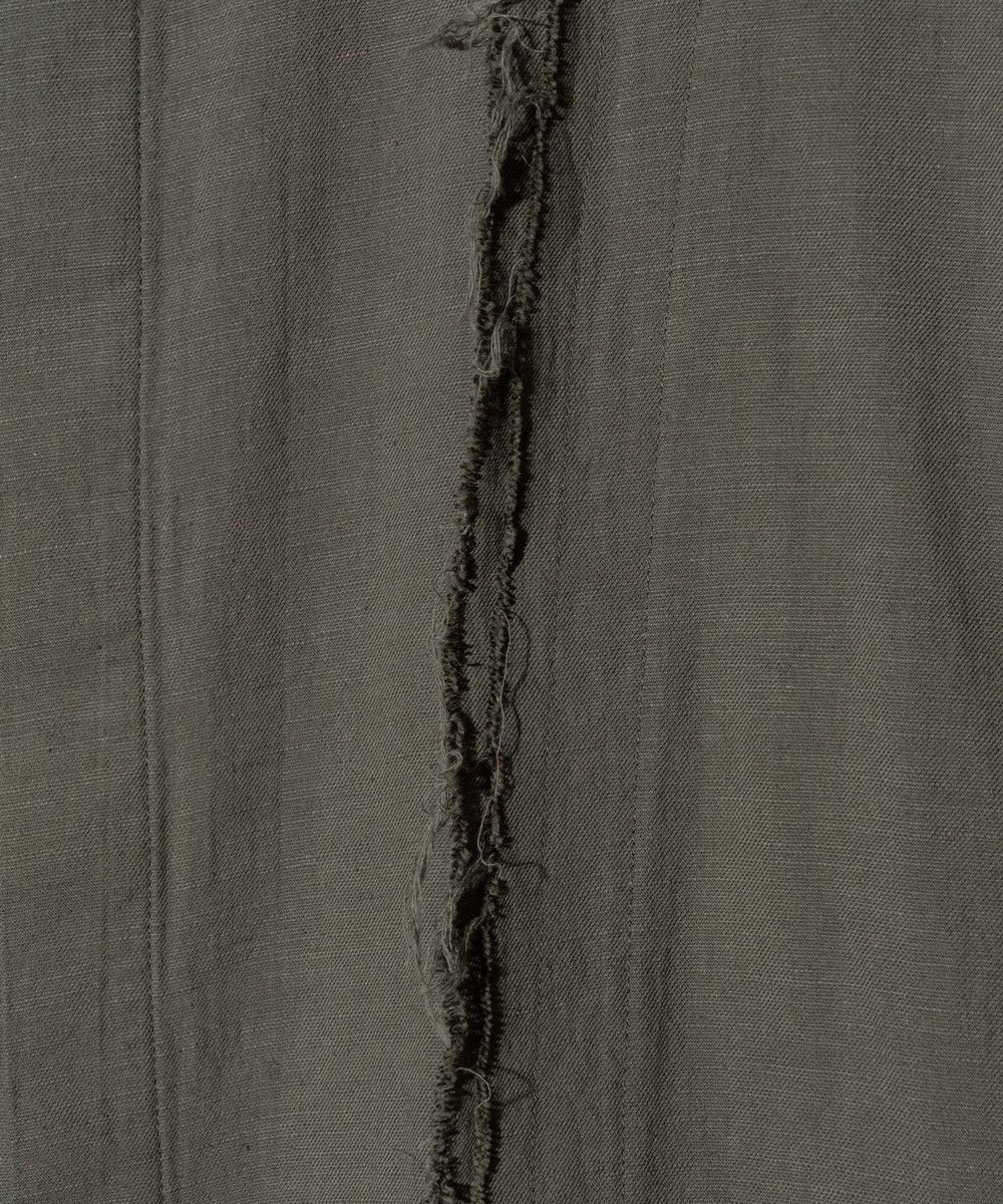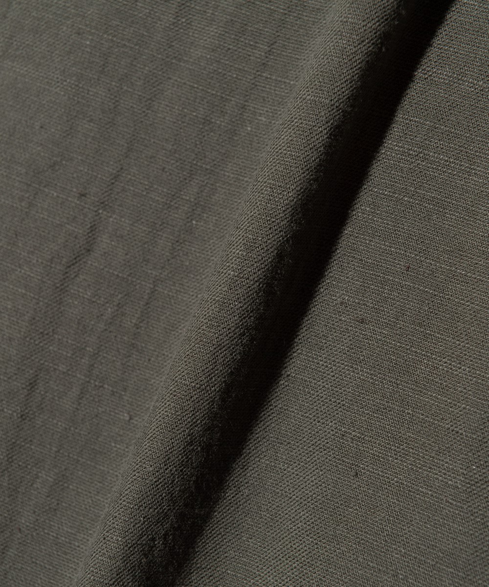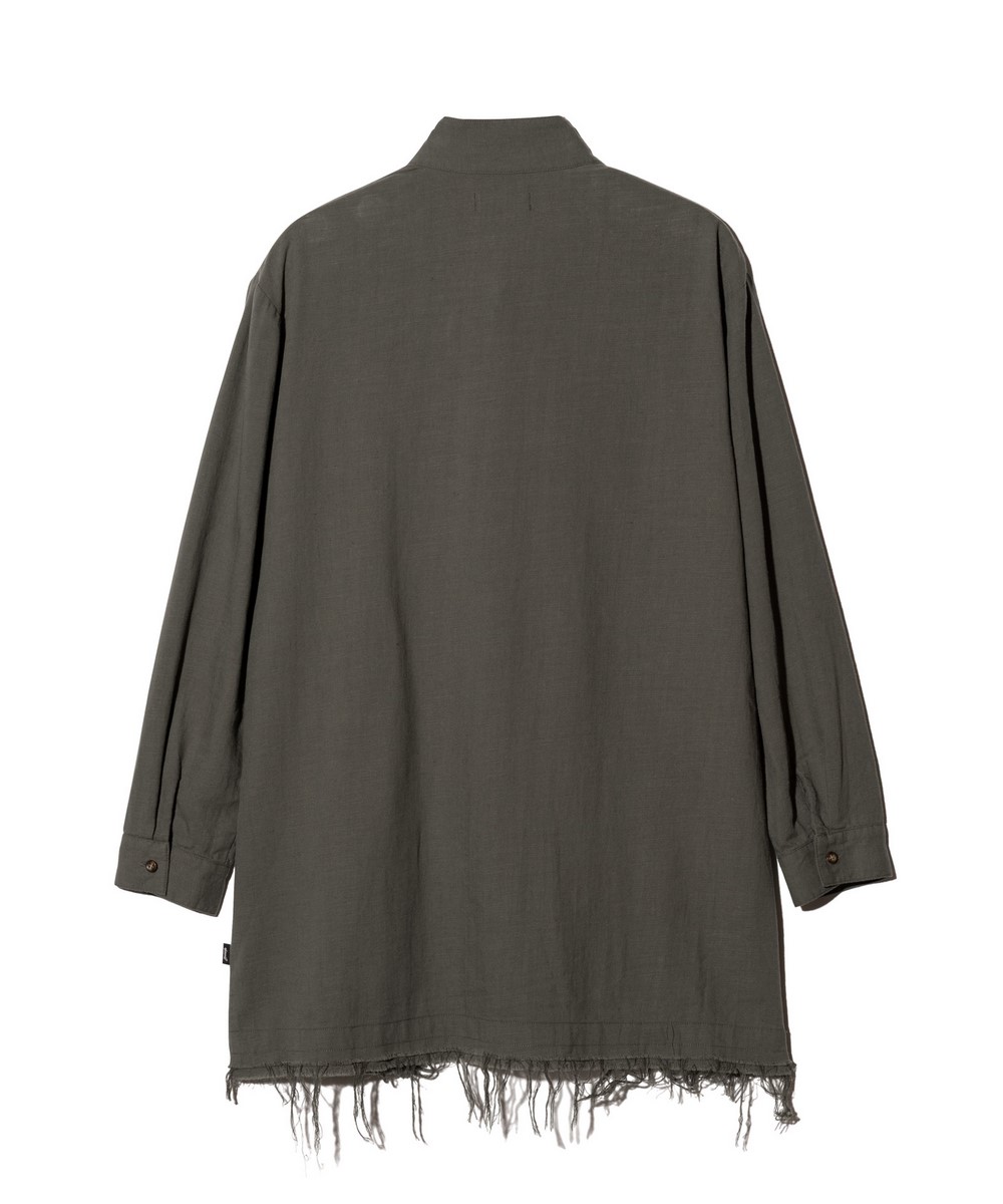 フェイクレイヤードを駆使して季節感を捉えたフォークロアスタイルを提案するLayered Cardigan Shirt。身生地に用いたのはスラブ混リネンコットンの風合い豊かなテキスタイル。着丈と身幅を長く設定したアウターライクなルーズシルエットのボディに、カーディガンタイプのレイヤードパーツを同生地でドッキングすることでボヘミアン調の佇まいを生み出しました。エッジ部分はカットオフで始末した後、仕上げのウォッシュ加工でほつれを演出。glambらしいダメージのニュアンスが放浪者然としたエイジングルックを完成させます。