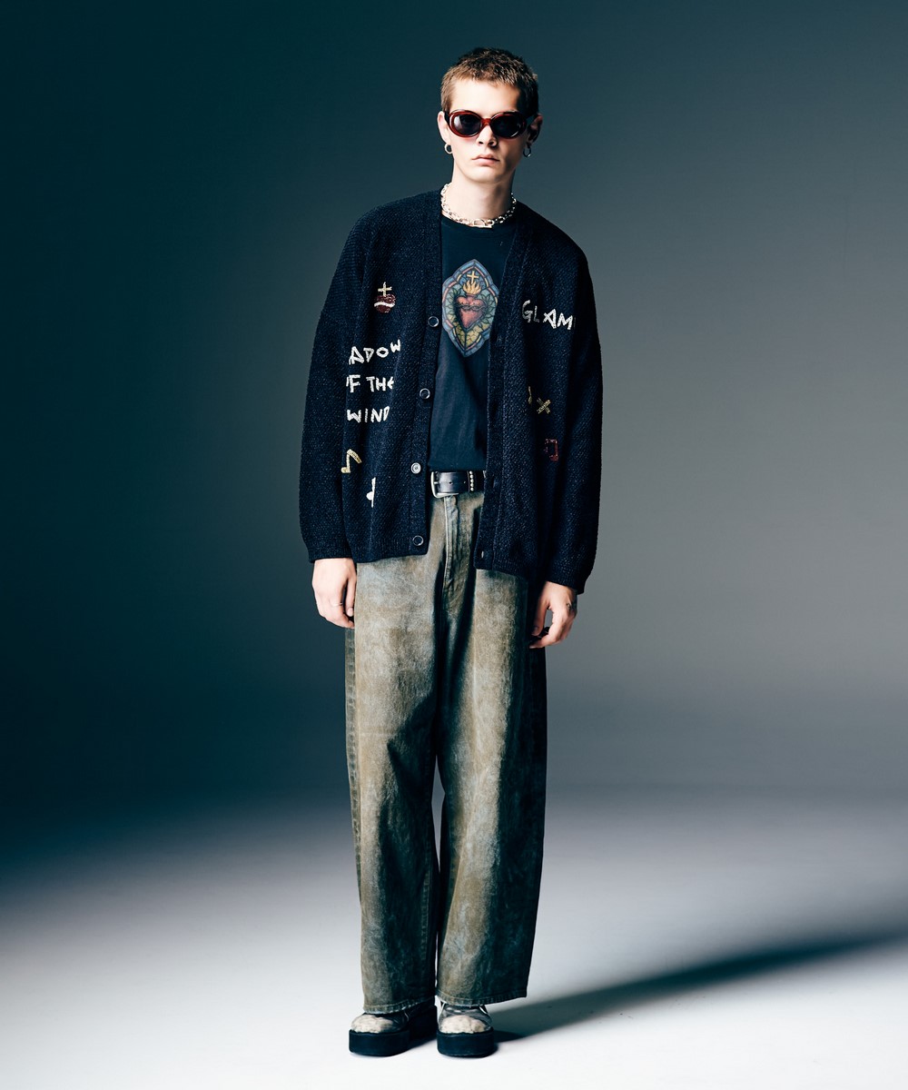昨春に好評を博したStained Glass T-Shirtをウィットあるアイデアを掛け合わせてアップデートした1枚が登場。クラシカルなステンドグラスをデザインのベースとしながら、バックスタイル右列の人物は古楽器リュートではなく現代的なギターを演奏。フロントでは中南米カルチャーに見られるクロス&ハートモチーフをあしらい、古今東西のデザインミックスをコレクションに展開するglambらしい仕上がりとなっています。ボディに用いたのはUSライクなオープンエンド糸を6.2オンスミディアムウェイトに編み上げたコットン100%の天竺生地。着るほどに身体になじむ風合いが魅力となっております。シルエットは着丈を長めに、身幅を広めに設けたビッグシルエット。サイドにはスリットを設けており、動きやすさとスタイリング性をもたらします。