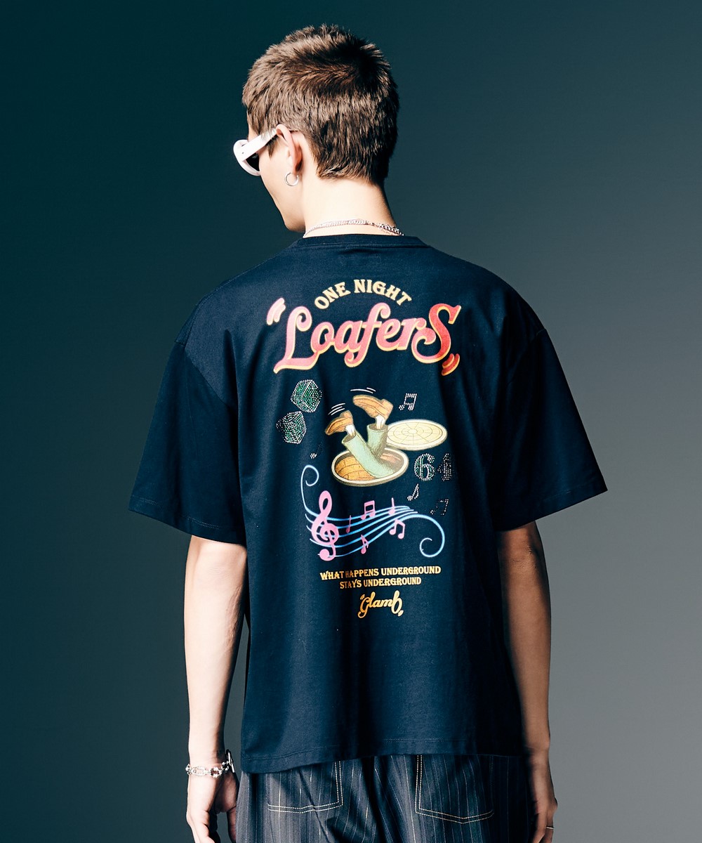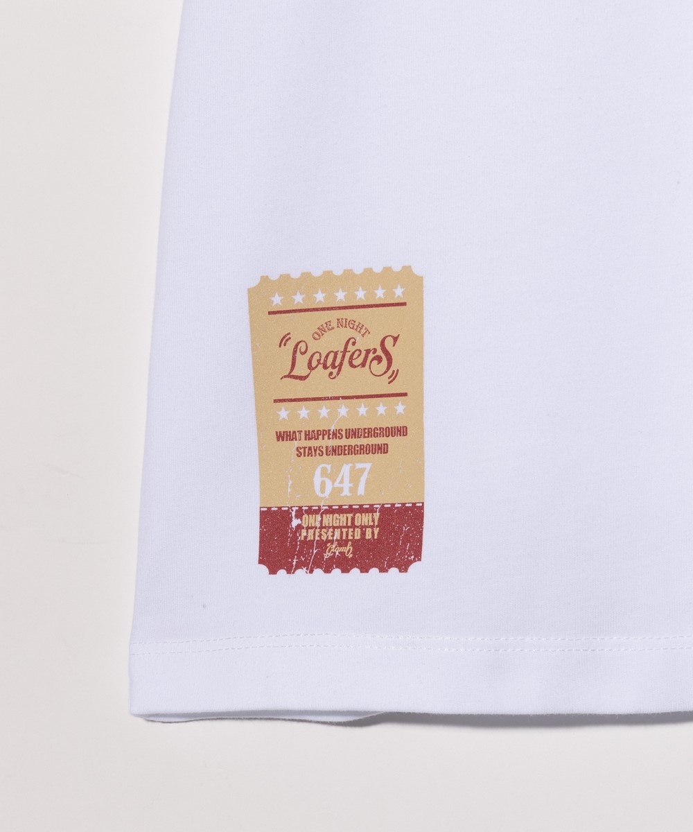 架空のロックバンド、“One Night Loafers”の一夜の公演の様子を身頃の前後を通して描いたLoafers Gig T-Shirt。前身頃は裾に入場チケットを模したプリントをワンポイントに。後身頃ではナイトクラブの狂騒を感じさせる賑やかな大柄へ、ラインストーン使いのダイスや数字もあしらって享楽的なムードにまとめています。テキスタイルに用いたのは表面の毛羽立ちを極限まで抑えて上質で滑らかな肌触りをもたせたコットン100%コンパクトコーマ。ストリートフレンドリーなビッグシルエットは抜け感ある着こなしを演出、今季のシューズラインに展開する Guitarist Loaferと合わせれば“One Night Loafers”のコンセプチュアルなロックスタイルが完成します。