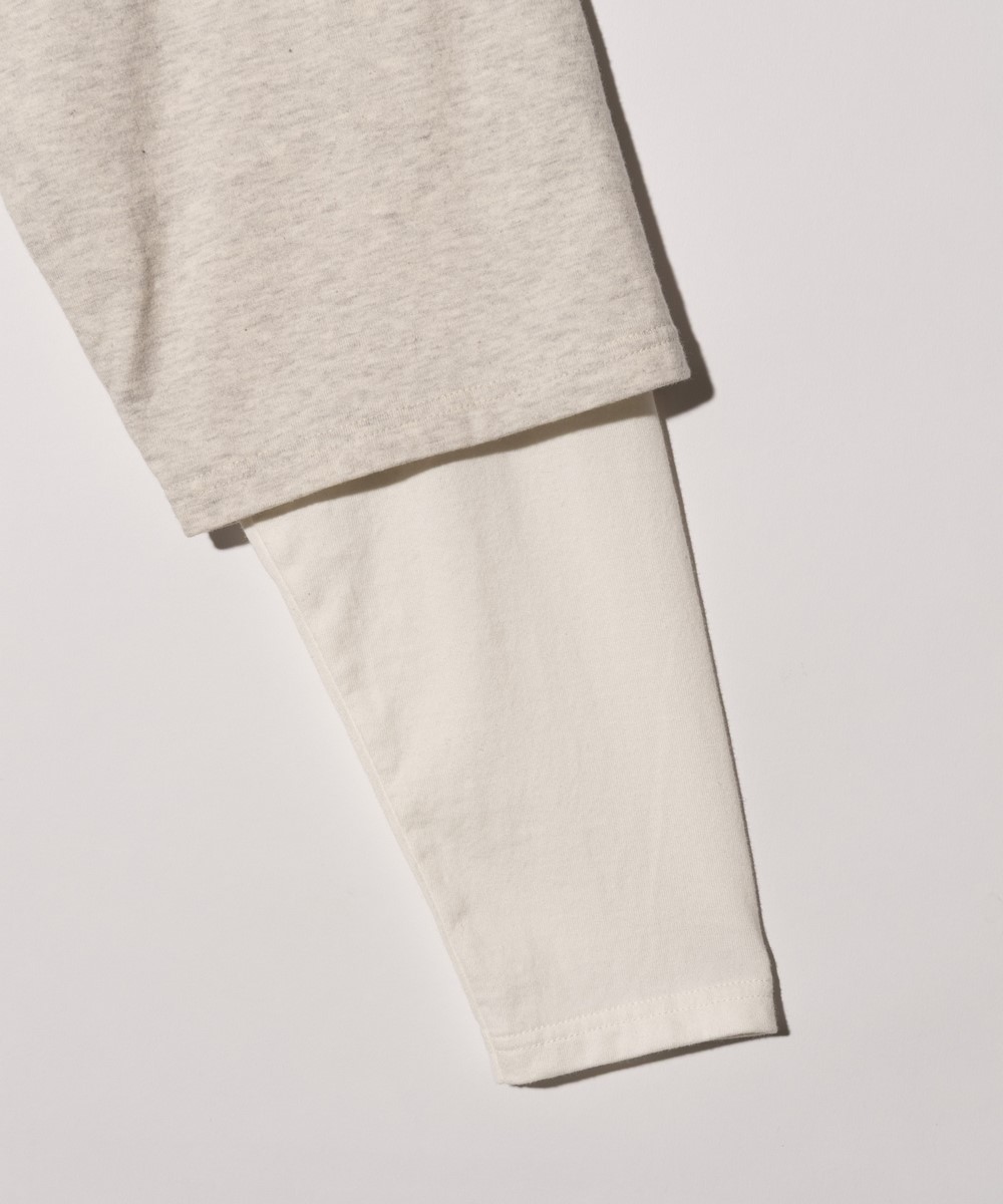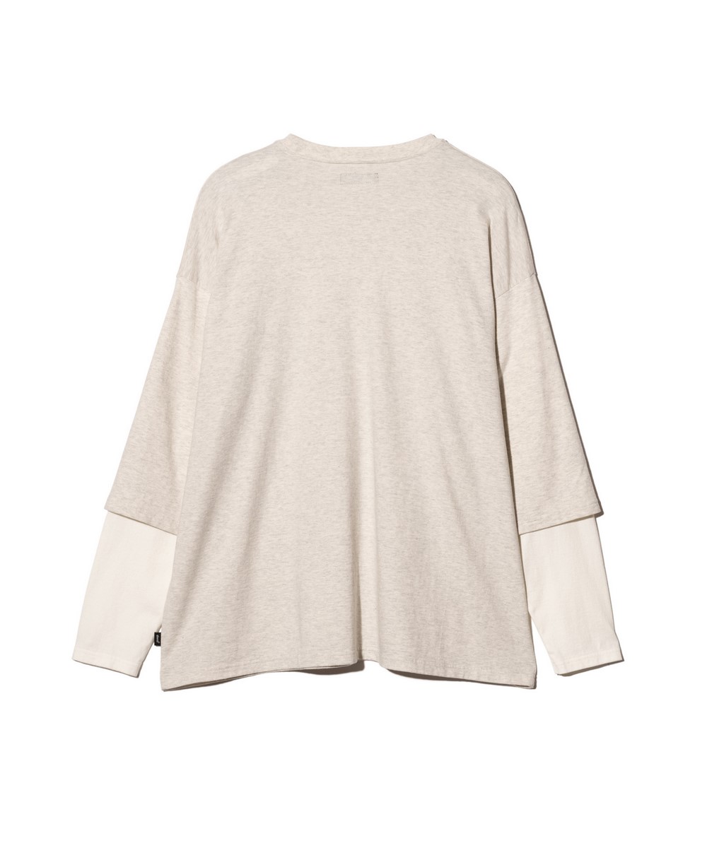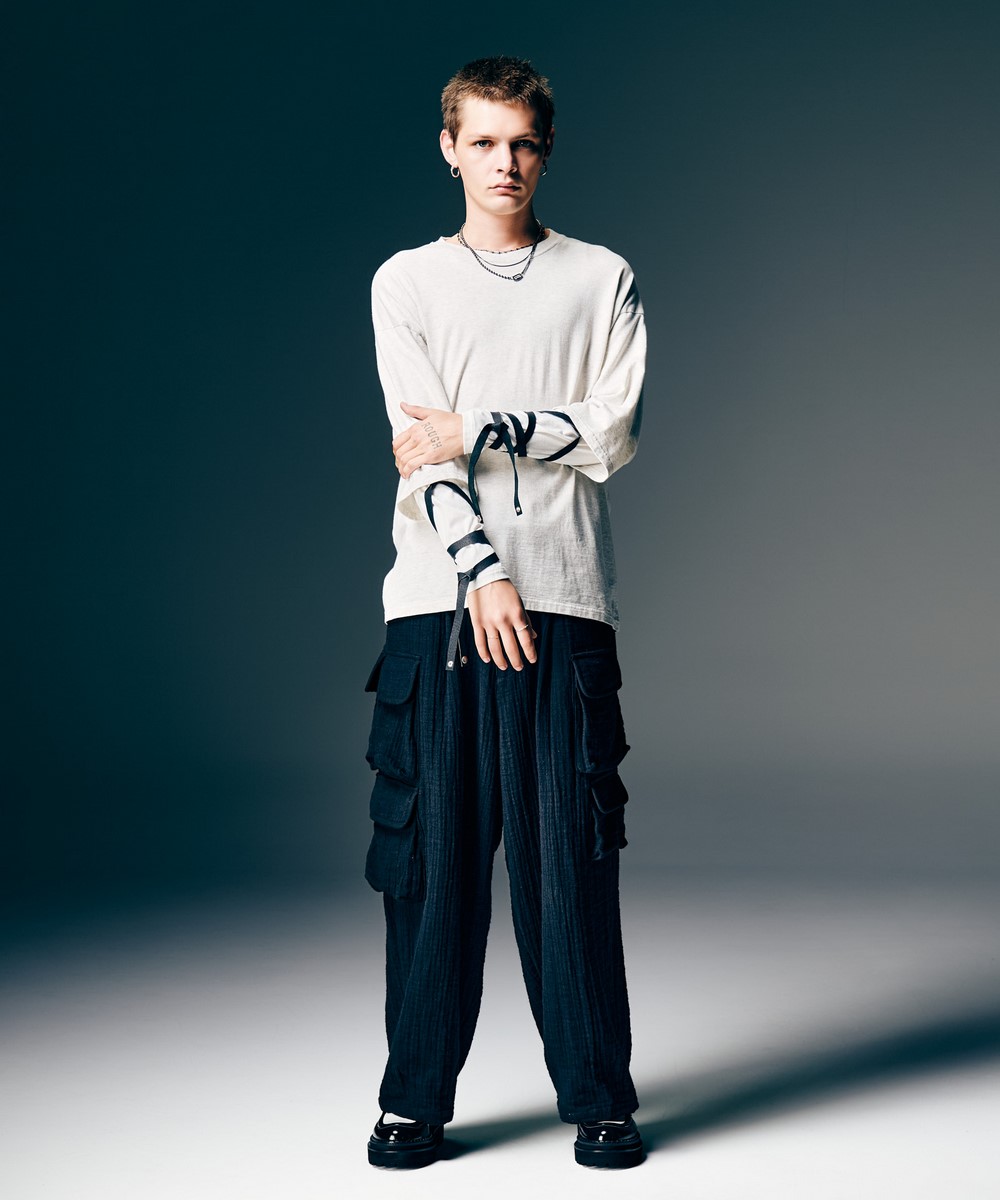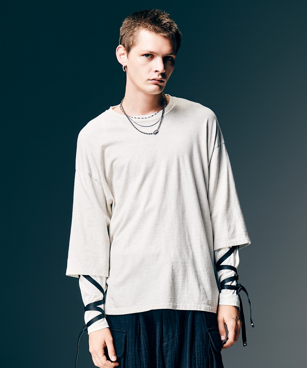 今春掲げるテーマ“Shadow of the Wind”の世界観をレイヤードスタイルに反映するBlow Layered Cutsew。フェイクレイヤードヴィジュアルはglambの得意とするディテールながら、本作ならではのディテールは7分袖のパーツ内側に配されたタブ。今季展開するストラップシリーズ“Blow”(*)を取り付けることが可能となっております。シルエットはドロップショルダーとワイドなフィッティングをかけ合わせたビッグシルエット。国内生産で作り上げた、程よい光沢としなやかな風合いを備えた40/2コーマ天竺のテキスタイルが上質な佇まいをもたらします。