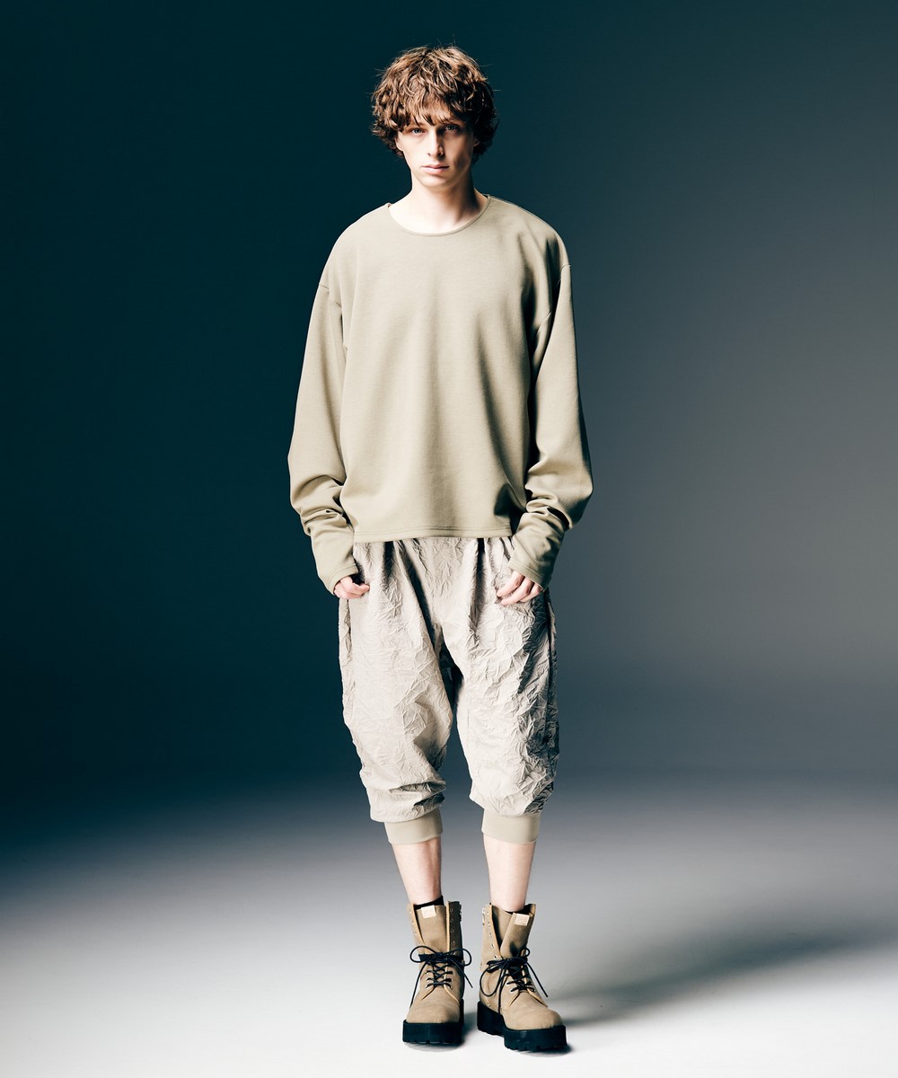 経年変化の表情をデザインに昇華、スラックスをアヴァンギャルドに再解釈したCrinkle Sarrouel Pants。2タックを備えたボディは深めの股上とテーパードを組み合わせてサルエルシルエットに。裾リブもあしらって股上から裾にかけて緩急あるテーパードラインを形作りました。テキスタイルに落とし込んだのは生地段階でキャッチワッシャー加工を施して皺を形状記憶させたライトウェイトのツイル生地。セットアップ展開となるCrinkle Shawl Collar Coatと合わせてコンセプチュアルなスタイリングをお楽しみください。