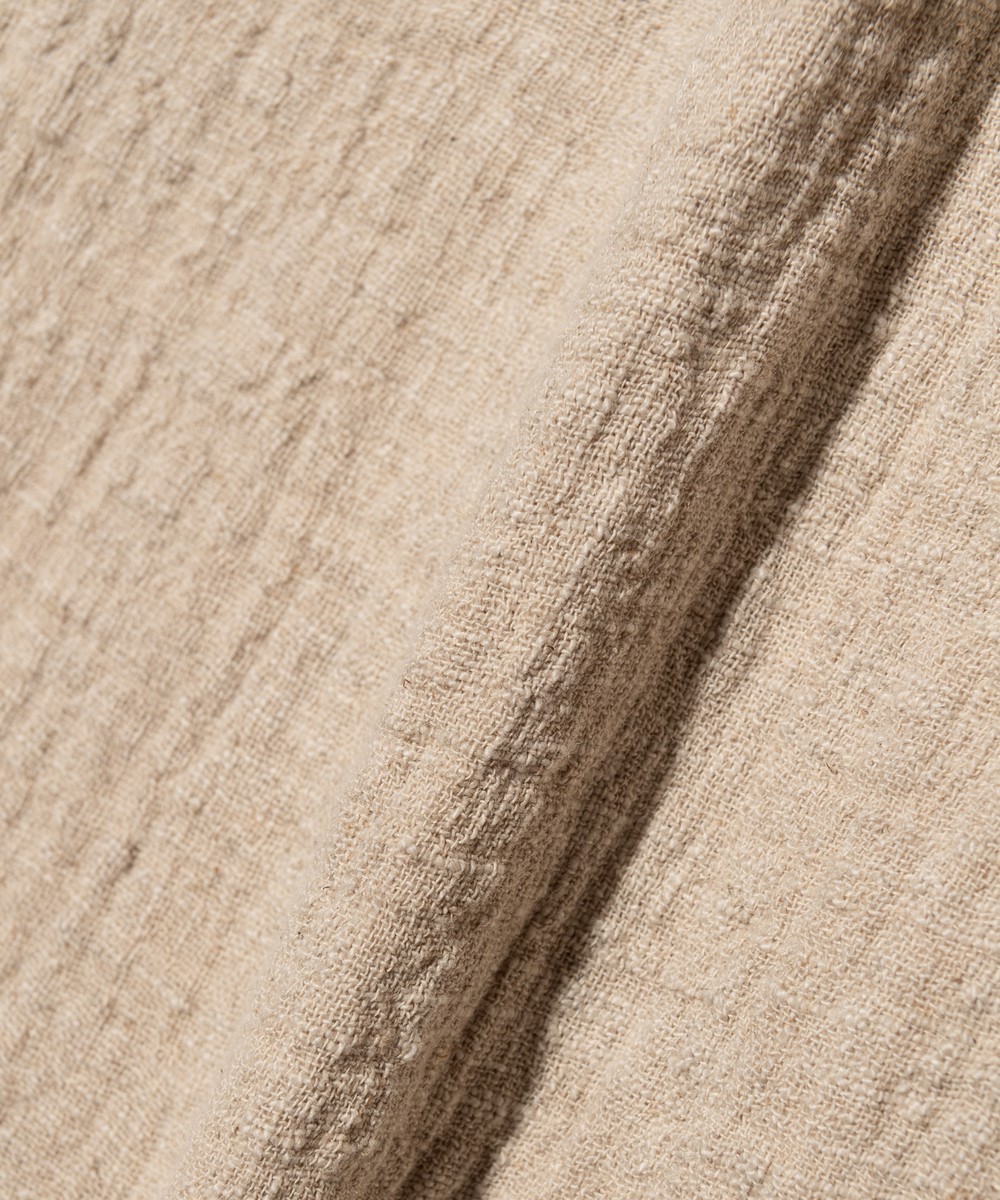 ミリタリーパンツにエアリーなテキスタイルを落とし込み、今季のコレクションテーマである“Shadow of the Wind”の陰影ある世界観を表現したLinen Cargo Pants。テキスタイルに用いたのはムラ感あるテクスチャを持ったスラブ混リネンを素材にしたダブルガーゼ生地。空気を含んだようなボリュームと軽さある風合いが季節感を捉えたスタイリングを楽しませてくれます。アシンメトリーにポケットを配したボディは腰元に1タック、裾にダーツを加えることでバルーン状のボリュームを持たせたワイドシルエット。裾のドローコードや後ろ身頃のゴムウエストなど、快適なスタイリングをアシストするディテールを上下にあしらいました。