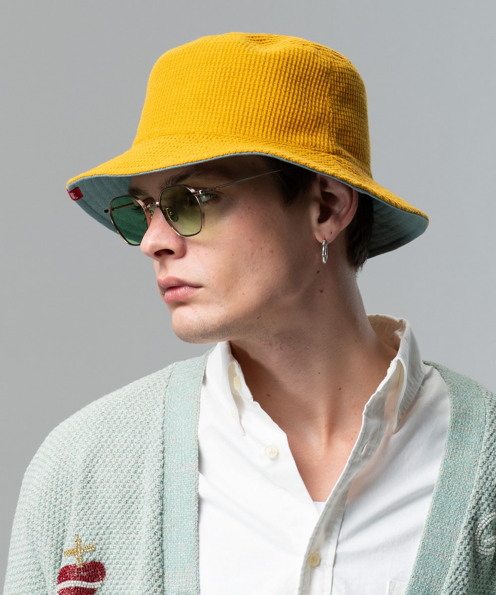 90’sストリートのムードを色濃く感じさせるバケットハットに意趣異なるリバーシブル仕様を持たせたReversible Bucket Hat。トップからブリム付け根までの傾斜を抑えた上品なボックス型のシルエットは、ブランド定番パターンをもとに国内工場で丁寧に形作ったものとなっています。ご注目いただきたいのはカラーバリエーションによって大きく異なるテキスタイル使い。Blackは逆面にアロハ柄をあしらって春から夏まで幅広いシーンに対応。日に焼けたような色合いのMustardは逆面に同じくアッシュがかったブルーグリーンの生地をあしらってカラーコーディネートを演出します。
