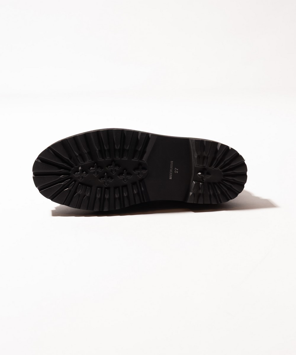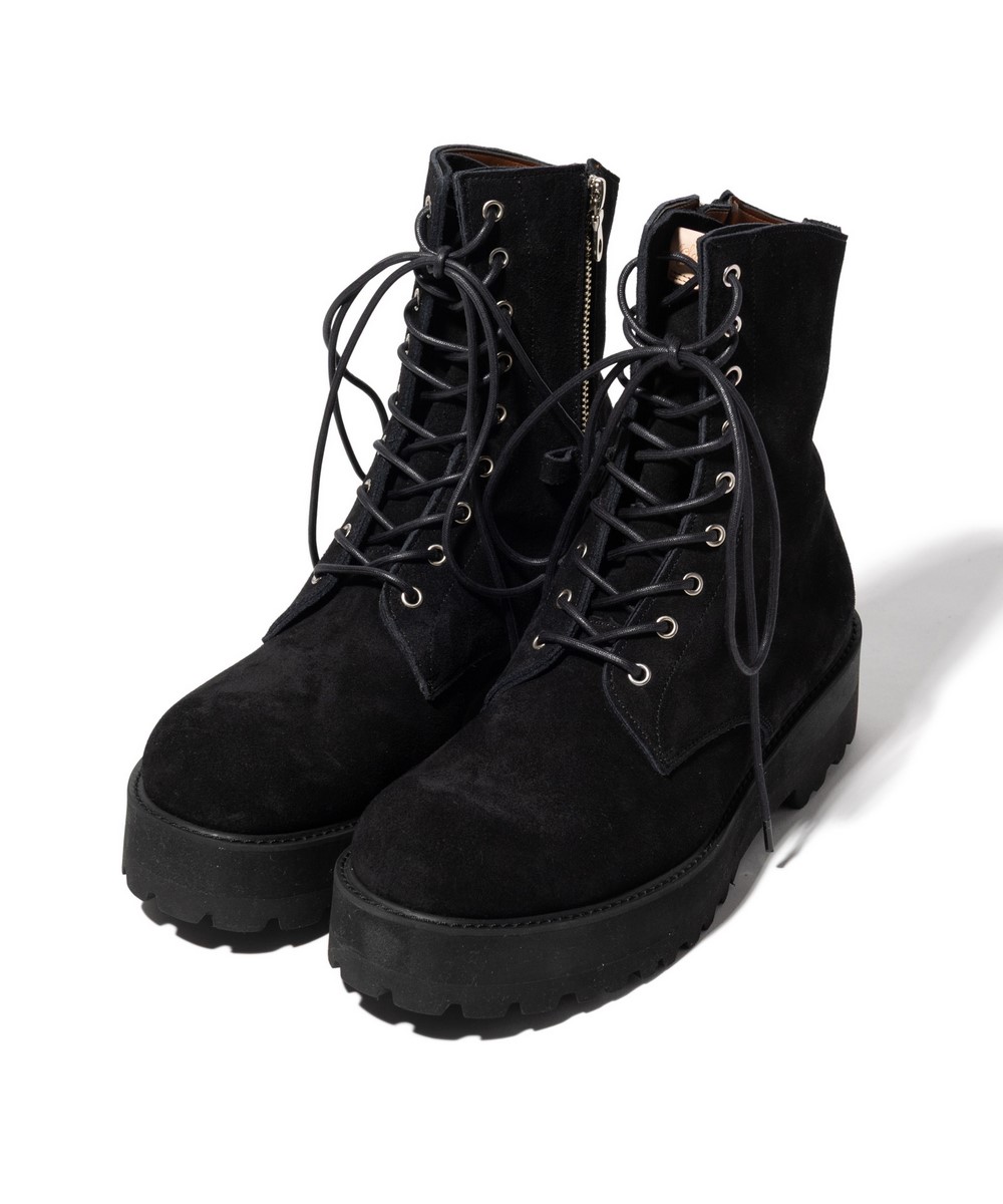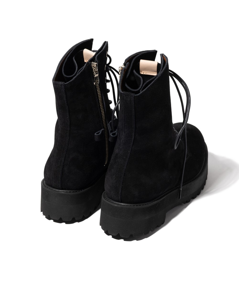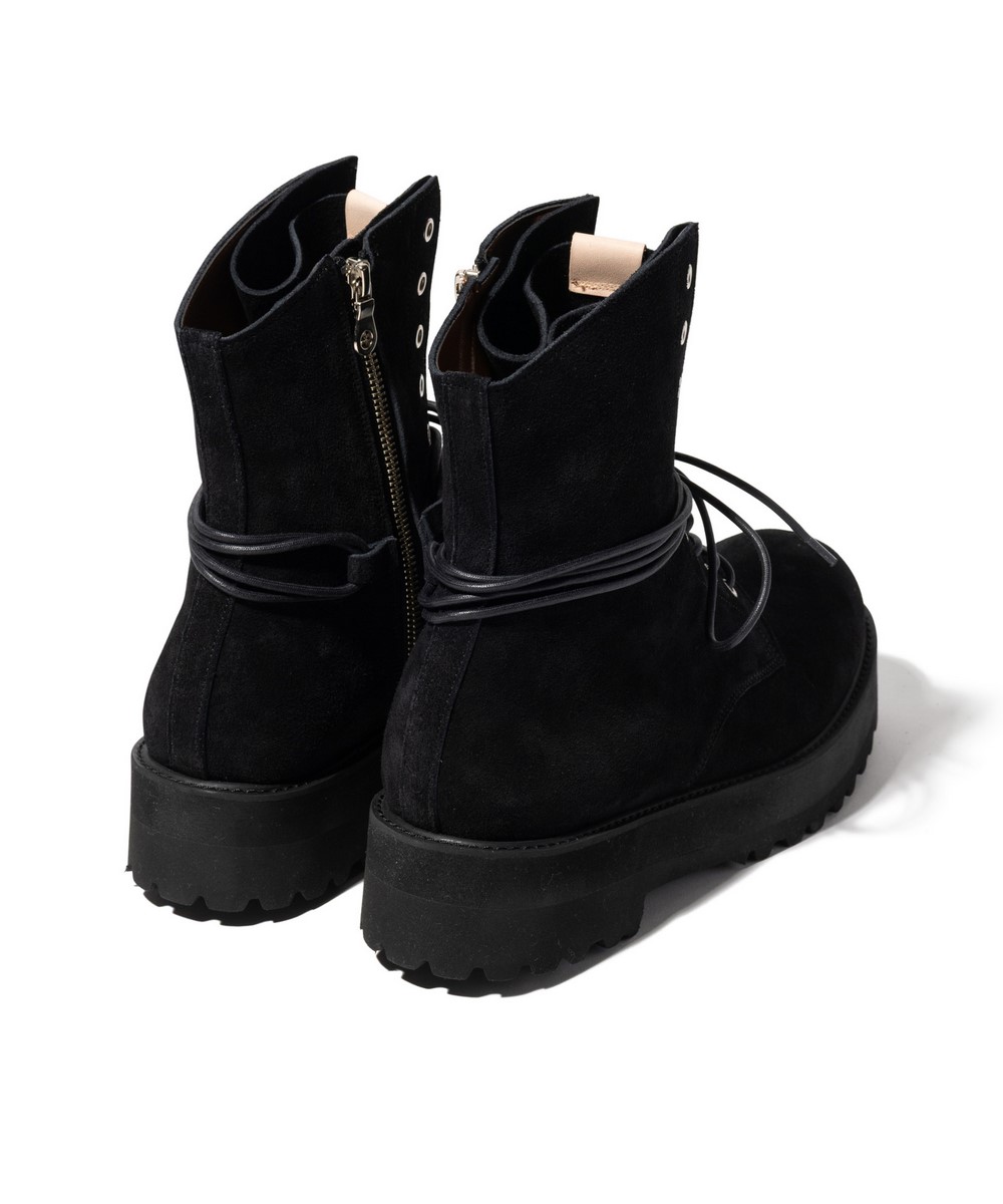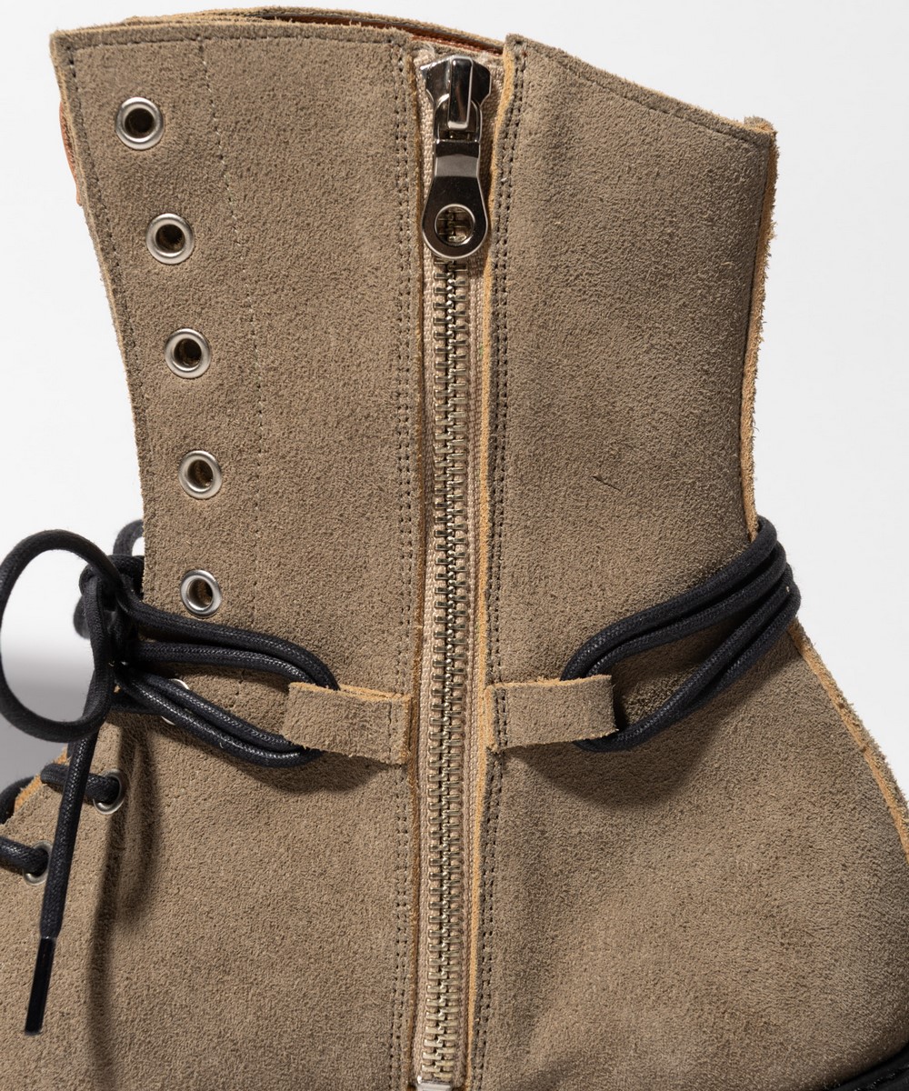 glambのインスピレーションとなる放浪者のイメージを足元に描き出すBohemian Drape Boots。9ホールのロングシルエットのアッパーにはカウレザーのスエードを使用。きめの細かな毛羽に加えて、履き込むごとの経年変化も着用者を楽しませます。シューレースはフルに結び上げる他、サイドにあしらったタブに通して中央に巻き付けることもできる2Way仕様。サイドにはジップを配してストレスの無い着用を叶えます。ソールは5cmのボリュームを備えるタンクソール。すべての工程は東京・浅草のシューズファクトリーが手掛けた、MADE IN JAPANのクオリティある一足です。