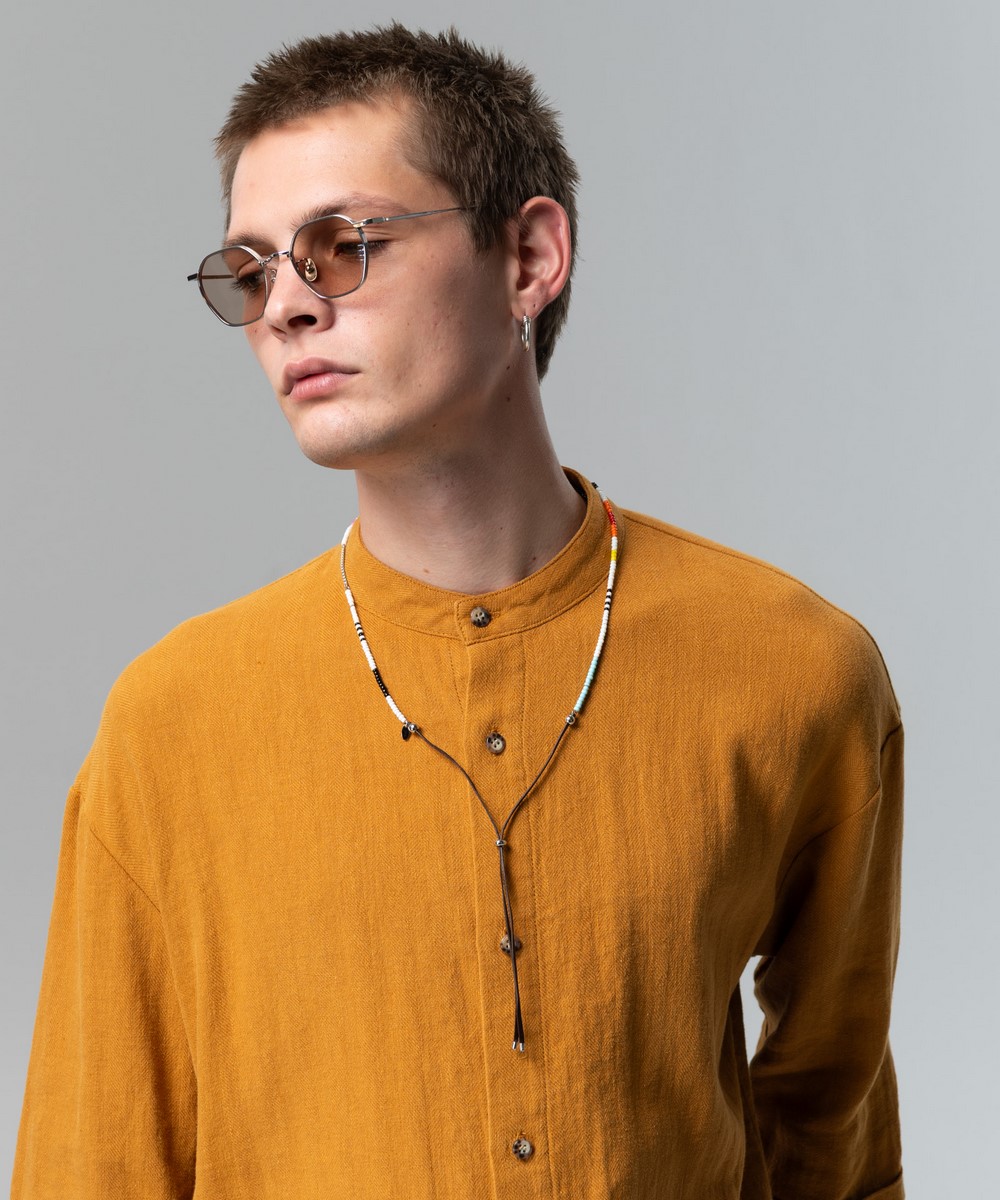 上質な牛本革コードに厳選したビーズを組み合わせた2 Way Beads Necklace。ビーズの配色はカジュアルさの中にネイティヴな温度感を残し、どんなスタイルにも馴染むバランス。絞り部分を前にすればループタイとして、ビーズ部分を前にすればネックレスとして楽しめる両面仕様となっております。
