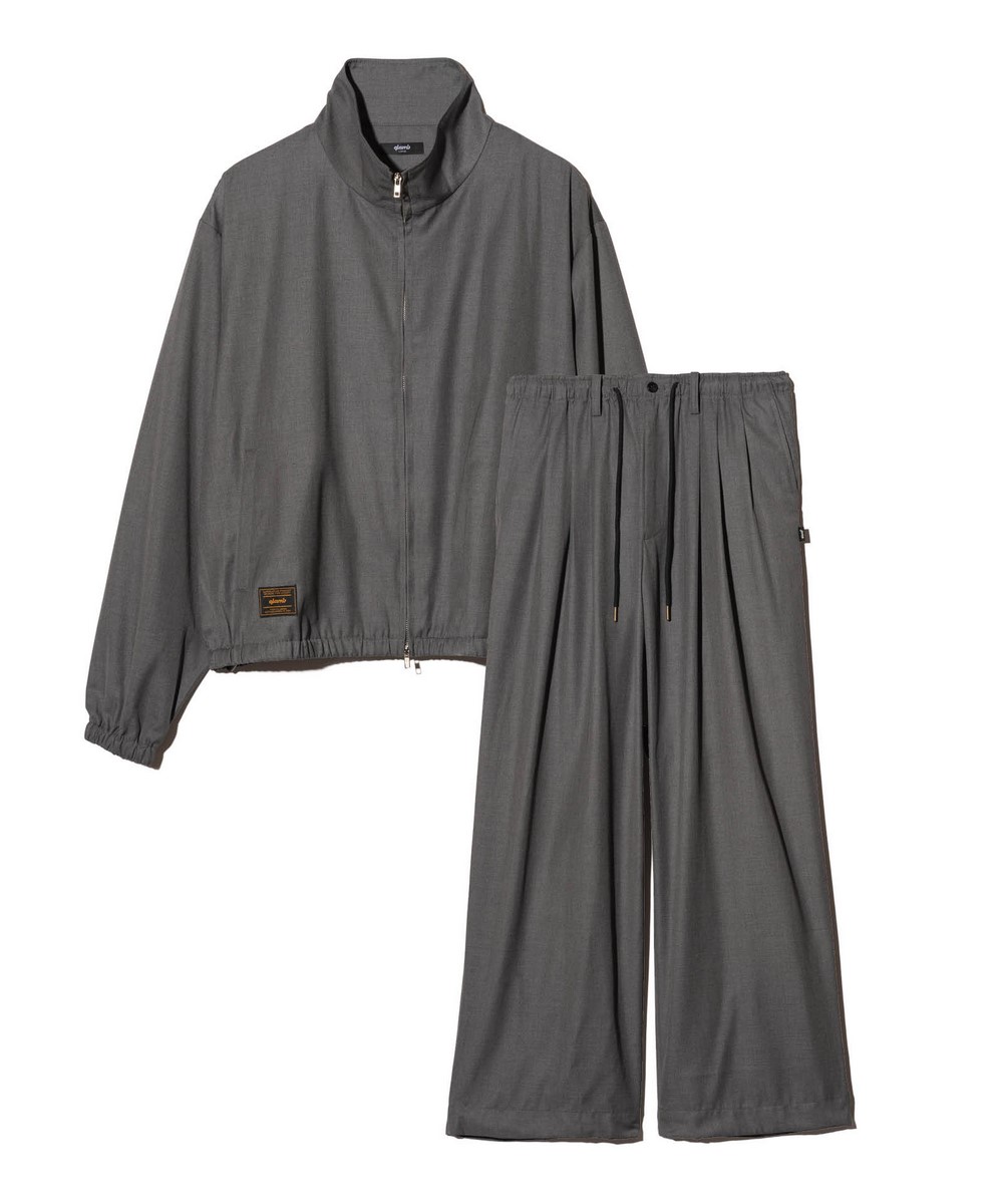 ドレスとスポーツをミニマルなルックスの中で掛け合わせたMonolith Track Blouson Set Up。テキスタイルに落ち感のあるレーヨンを含んだストレッチ生地を用いて仕立てました。ワイドシルエットのトップスは首元をハイネックにすることでアーバンな輪郭に。袖口や裾も小ぶりなギャザーを用いることでソリッドな印象をより強調しています。ボトムスは左右6本ものタックでバルーン状に構築したバギーシルエット。ウエストのドローコード仕様に加え、ゴム仕様の裾はスピンドルで幅調整が可能となっており、シチュエーションやコンディションに合わせて着心地をアレンジいただけます。