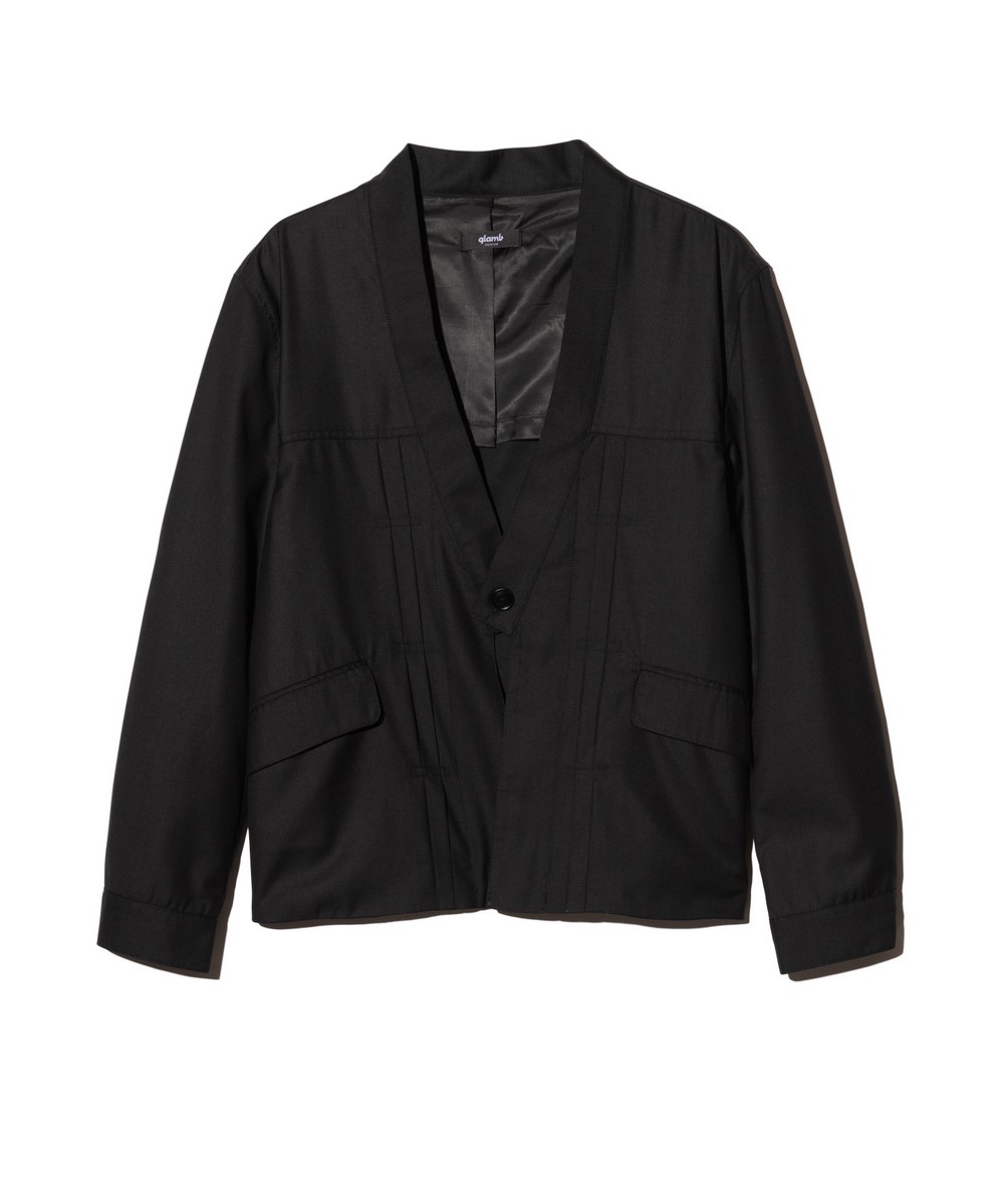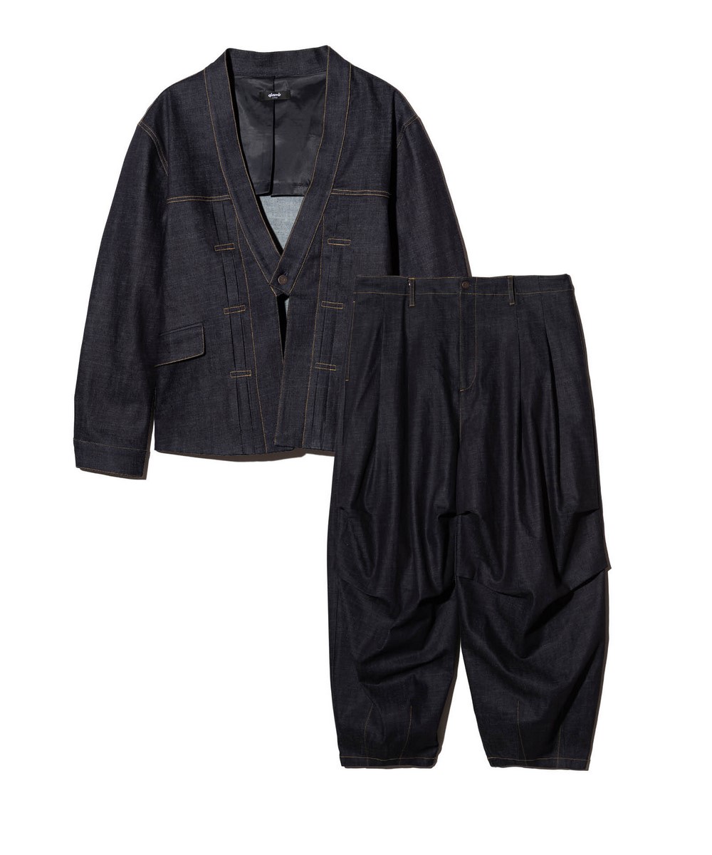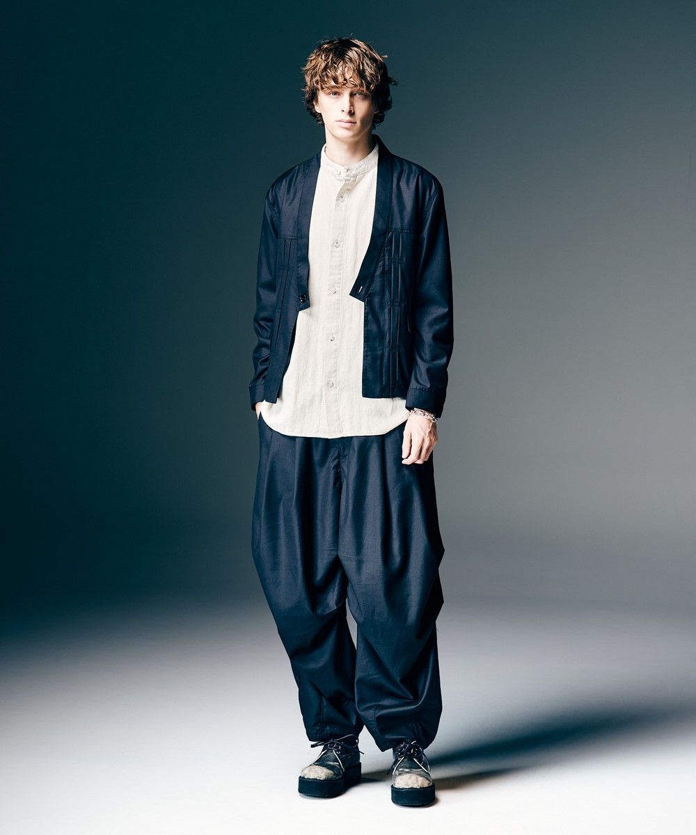 和装のエッセンスを取り入れたジャケットと、ブランドの新定番となっているボトムスを組み合わせたのがKimono Based Jacket Set Up。トップスはノーカラーのフロントデザインに着物にインスピレーションを得たディテールをミックス。一つボタンのボディは着丈をコンパクトにまとめたショートレングスに仕立てています。ボトムスはコレクションの度に好評を博すタック使いのバギーシルエットを用いたCrossover Tuck Pants。腰元に4タック、膝に2タック、裾にダーツを設けて構築したバルーンのボディはレングスを九分丈に設定し、足元にオフバランスな視覚効果を演出します。2色展開となる本作は、Blackに滑らかな落ち感のレーヨン混スーツ地、Indigoはクリーンなルックスのノンウォッシュデニムを使用。野心的なセットアップスタイルからそれぞれの単体使いまで、可能性に満ちた2アイテムをバリューあるセットプライスで提案します。