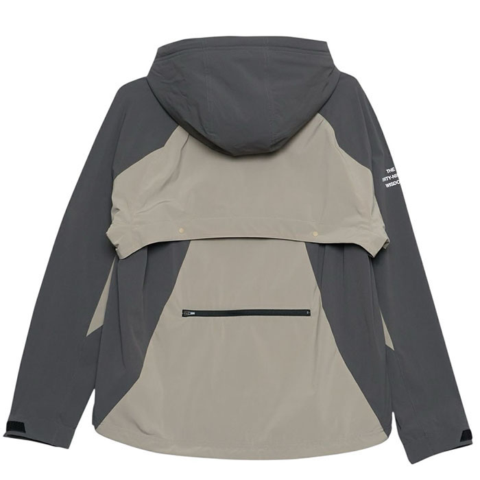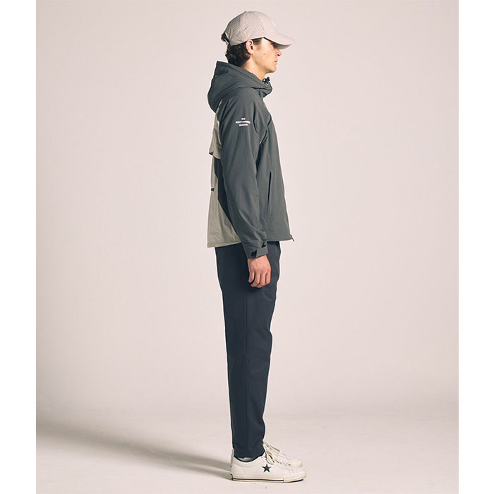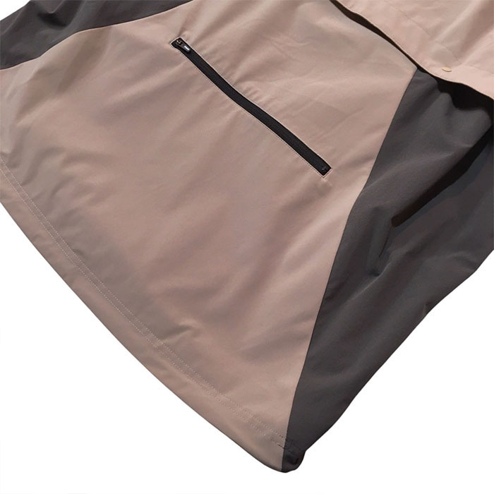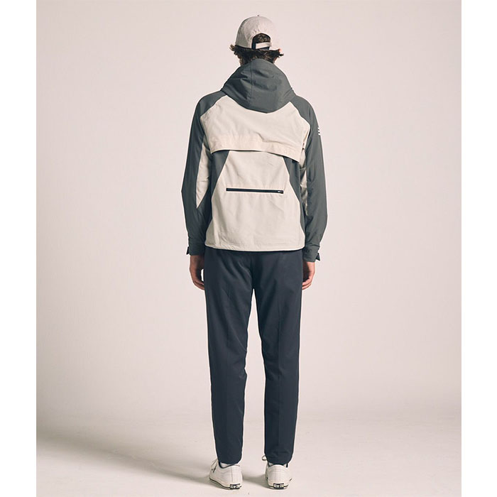 脇・背中・肩部分には、しなやかな伸びと撥水性を兼ね備えたナイロン2WAY素材を切り替えで配置し、デザインアクセントとパフォーマンス性を両立しています。