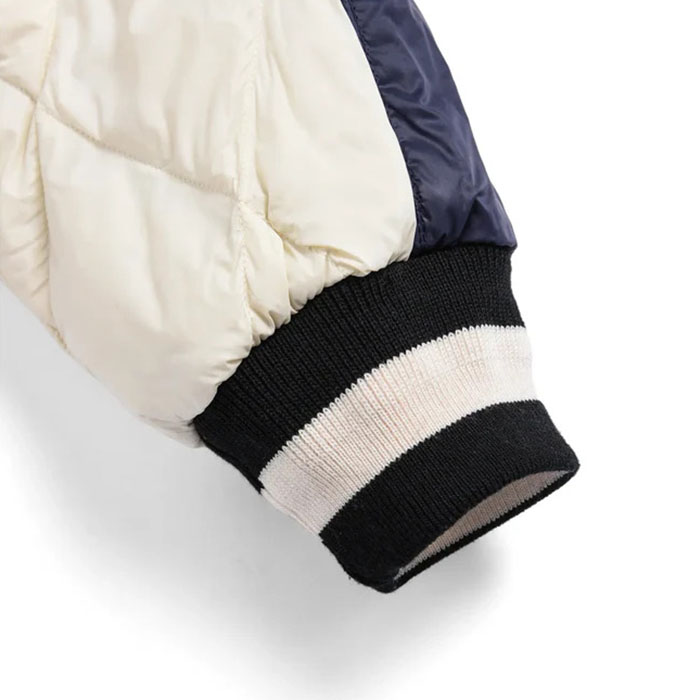 表側は、毛羽のあるベロア素材にスカジャン刺繍を、裏側は、ダイヤキルトダウンジャケットで、気分やコーデに合わせて楽しめるリバーシブル仕様に仕上げました。