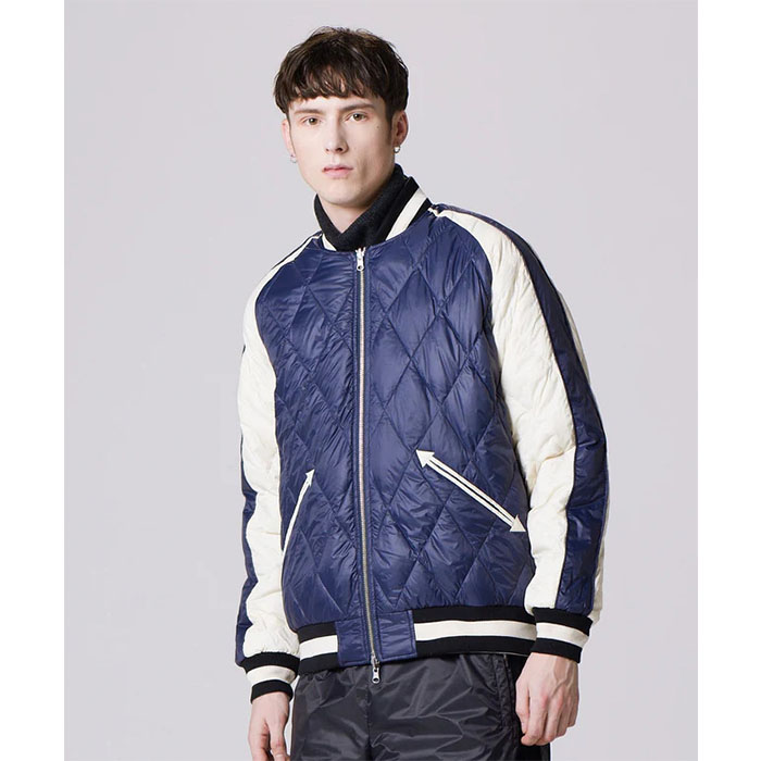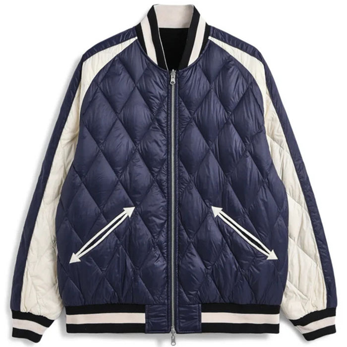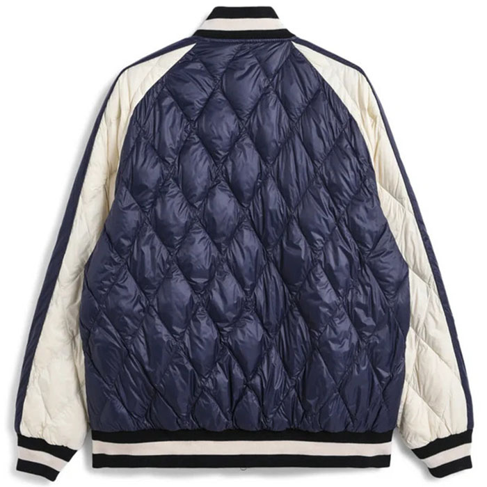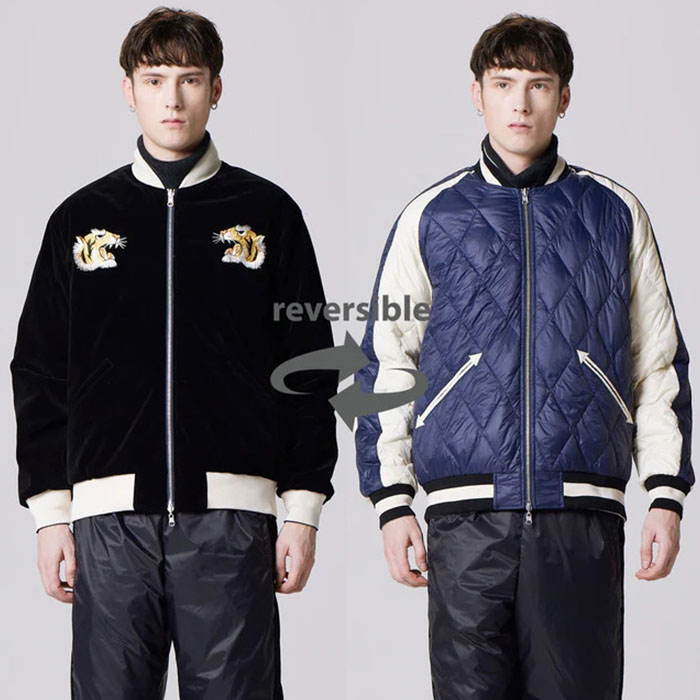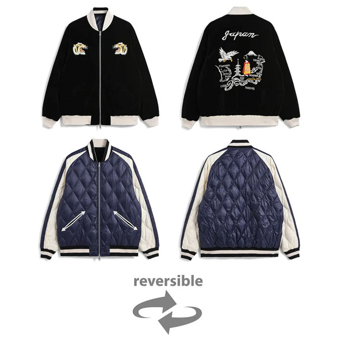 スカジャンとダウンを組み合わせた、スカジャン風リバーシブルダウンジャケット。