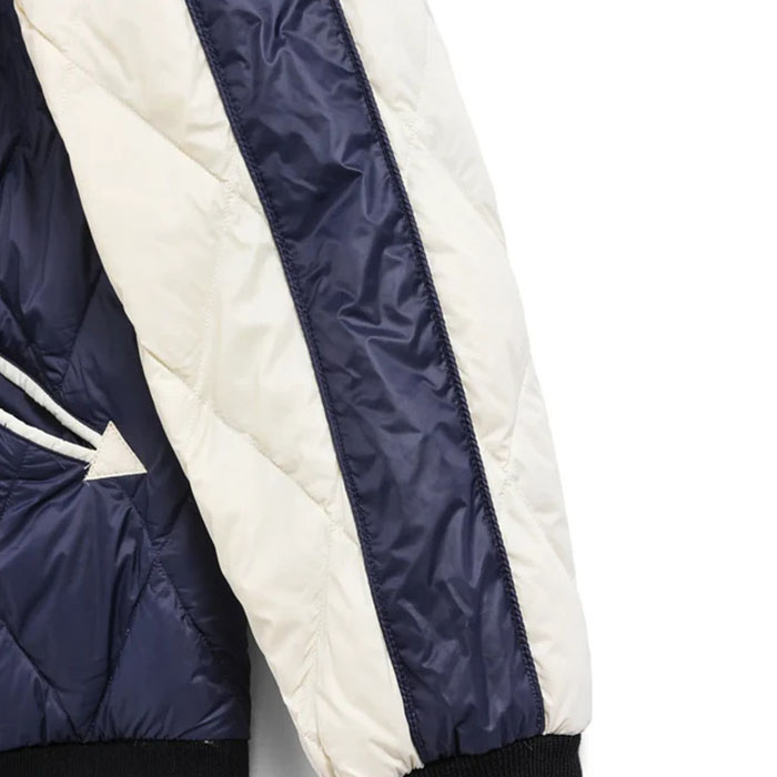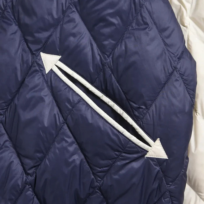 ■素材 : 表地:ポリエステル100% / フロック部分:ポリエステル x ナイロン / 裏地:ナイロン100% / リブ部分:ポリエステル97% ポリウレタン3% / 刺繍部分:レーヨン100% / 中綿:ダウン95% フェザー5%