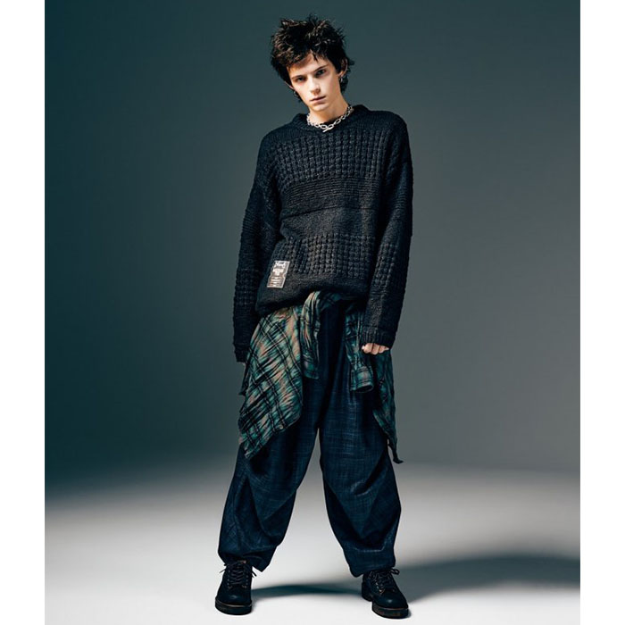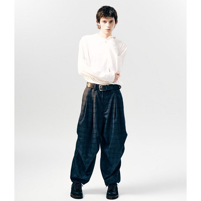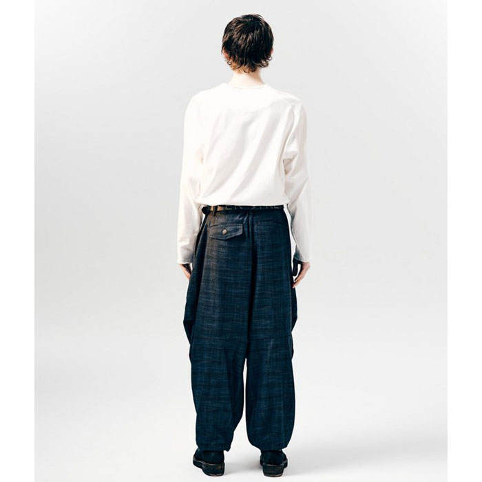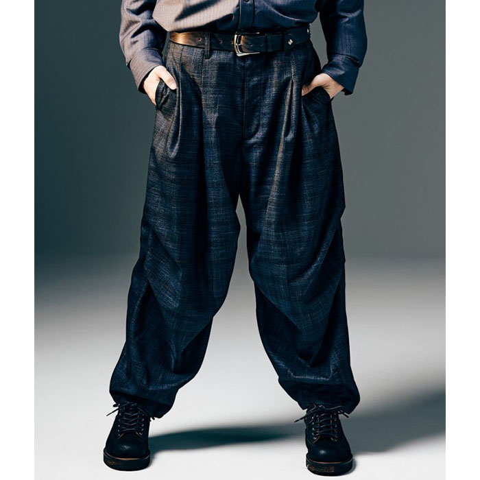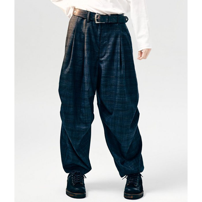 ブリティッシュトラッドな柄使いと構築的なワイドシルエットを組み合わせ、glambならではのネオクラシックを提案するGlen Check Tuck Pants。ワイドシルエットのボディには腰元に4タック、膝に2タック、さらに裾にダーツを施してボリュームある輪郭を構築。そこに落とし込まれたグレンチェック生地が、タックの陰影と相まってジオメトリックな視覚効果をもたらします。カラーバリエーションはいずれもノスタルジックな色使いの2色展開。秋冬の着用を想定して裏地を配した仕立てを行っております。