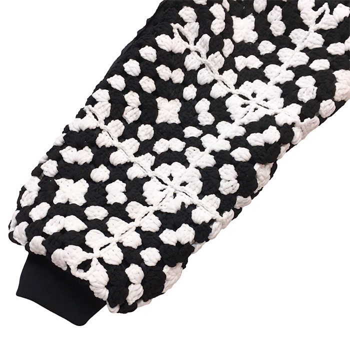 インサイドアウトのデザインと袖の手編みによるかぎ針編みのニット切り替えデザインがポイントとなったアイテム。