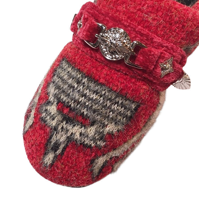 ニット素材のアッパーに、オリジナルのウェスタンモチーフやダンシングマンのグラフィックを編み込み、甲部分には煌めくコインメタルをあしらった。