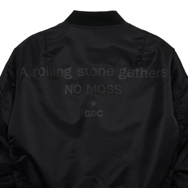 背面には同色でさりげなくA rolling gathers no mossのメッセージを落とし込み、ミリタリーウェアにGDCらしい遊び心を添えている。