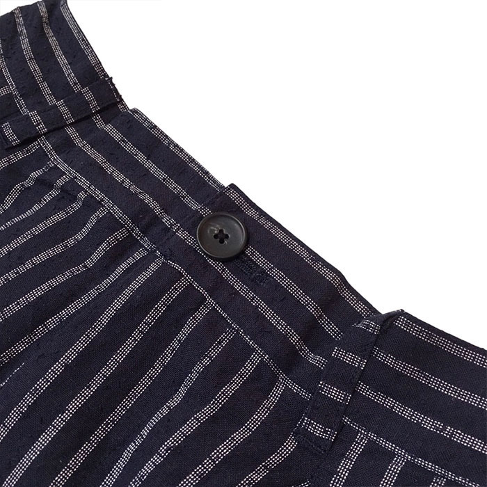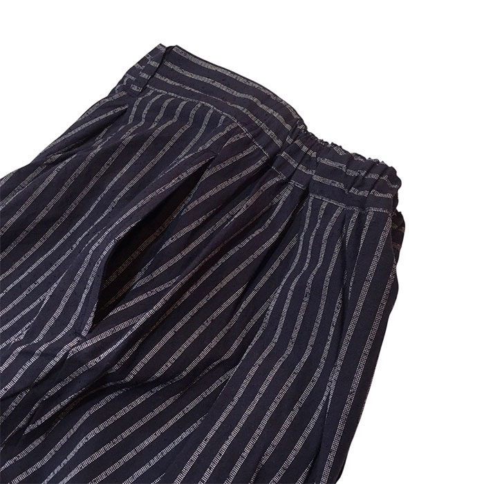 カールヤーンを使用したストライプ素材に洗いをかけ、表面に毛足感を持たせたパンツ。