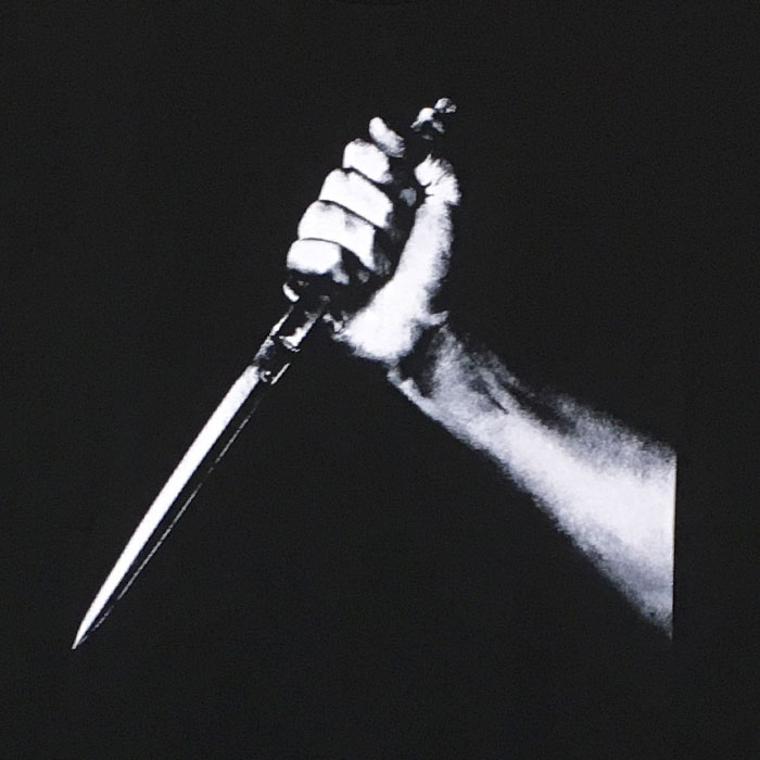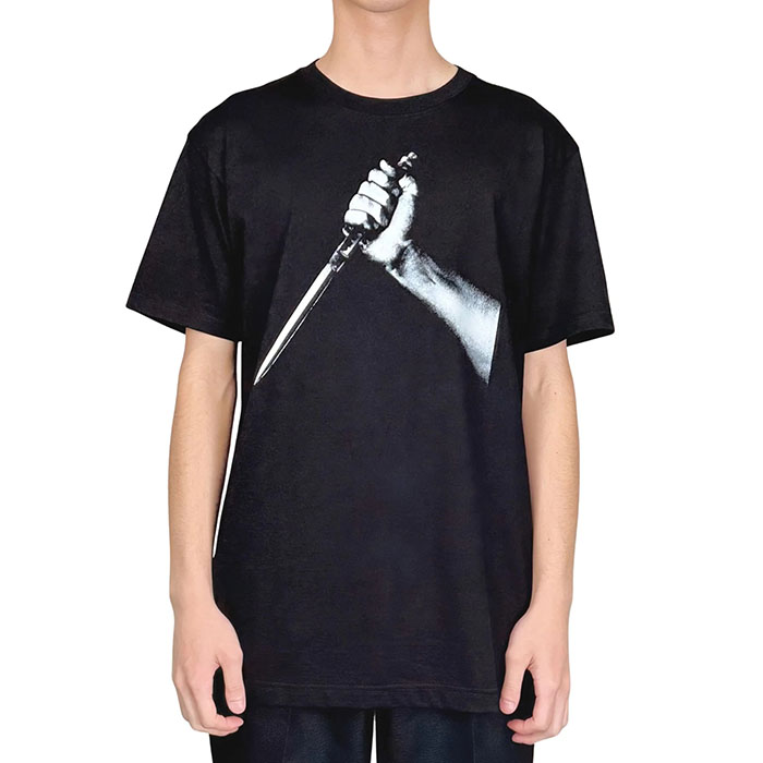 アメリカの写真家ロバート・メイプルソープが、自身を被写体にナイフを手にした作品Self Portraitから着想を得た、プリントクルーネックTシャツ。