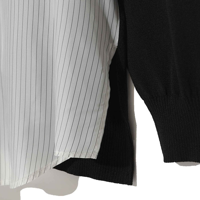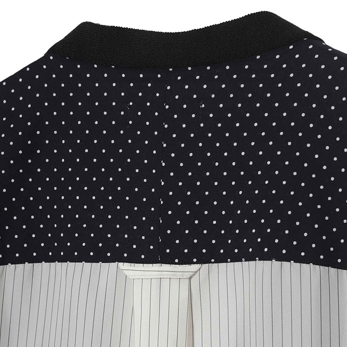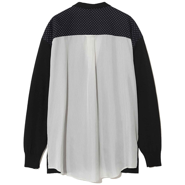 フロントはシャリ感のあるニットカーディガン、バックはドットとストライプの切り返しシャツ。